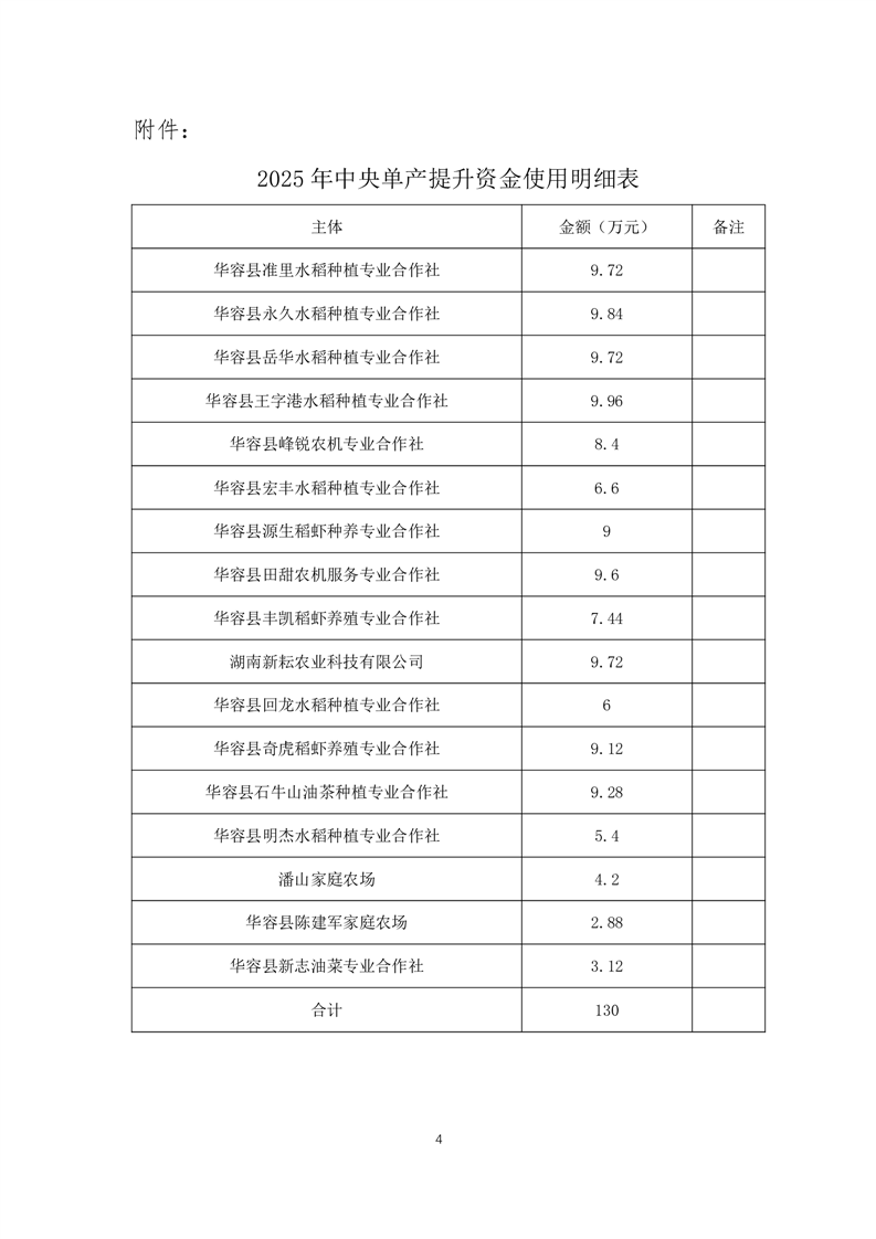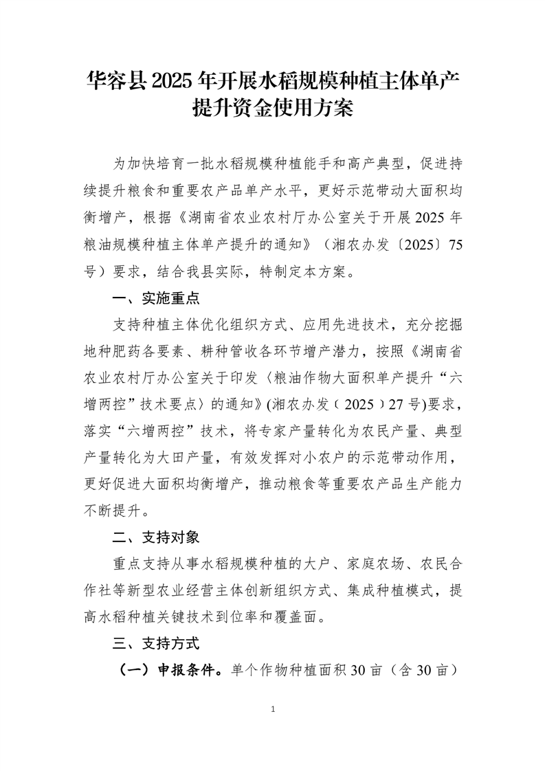 华容县2025年开展水稻规模种植主体单产提升资金使用方案