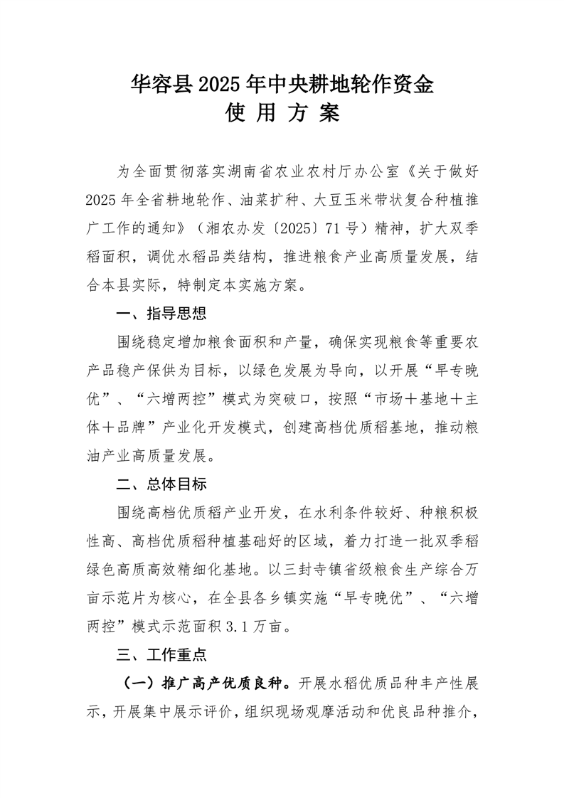 华容县2025年中央耕地轮作资金使用方案