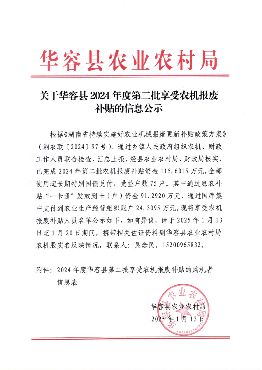关于华容县2024年度第二批享受农机报废补贴的信息公示