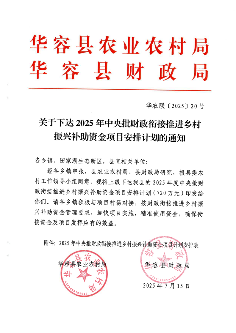 华农联(2025)20 号-关于下达2025年中央批财政衔接推进乡村振兴补助资金项目安排计划的通知-720W