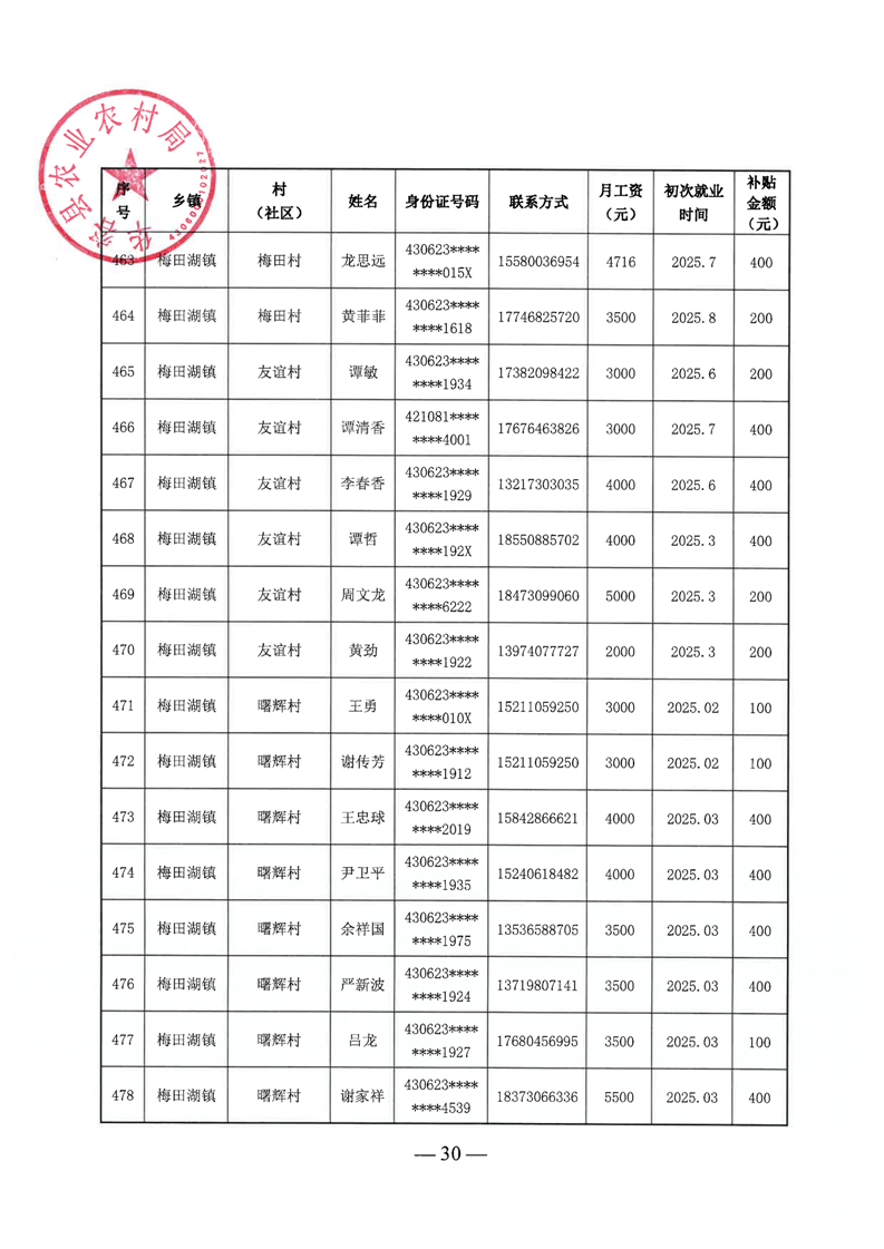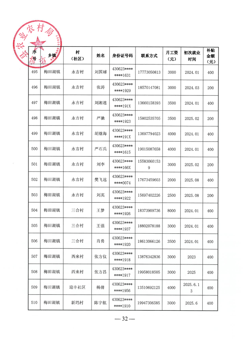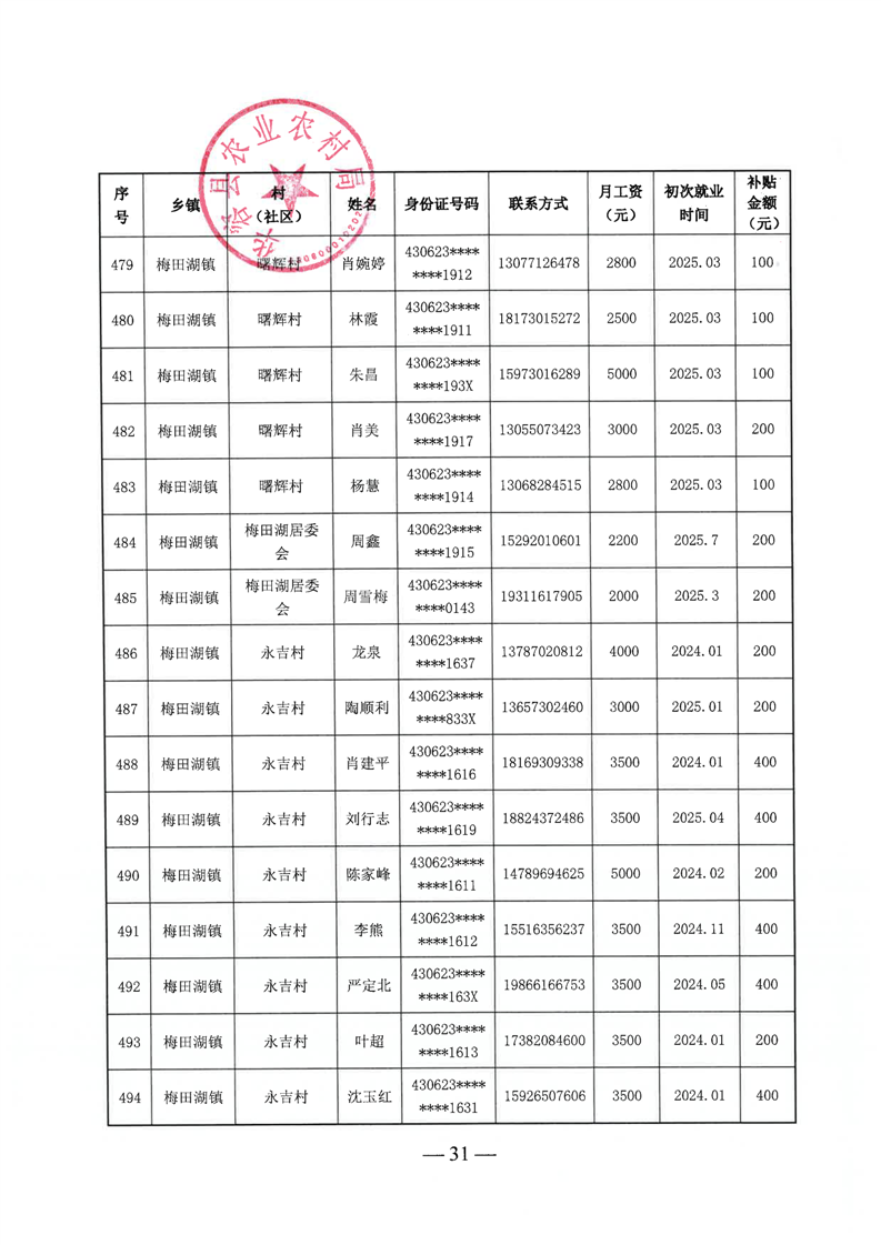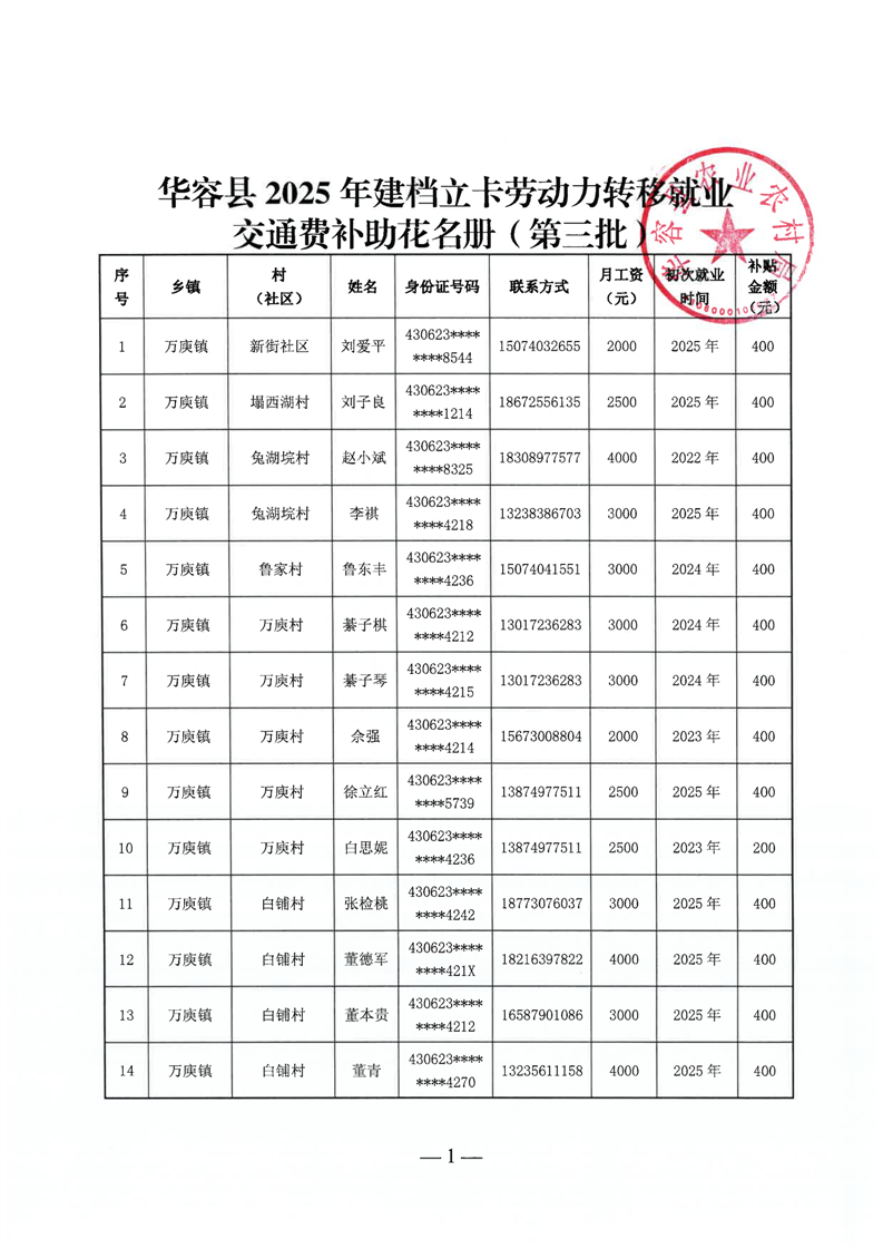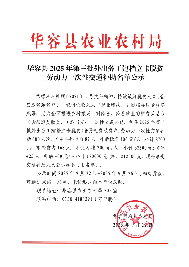 华容县2025年第三批外出务工建档立卡脱贫劳动力一次性交通补助名单公示