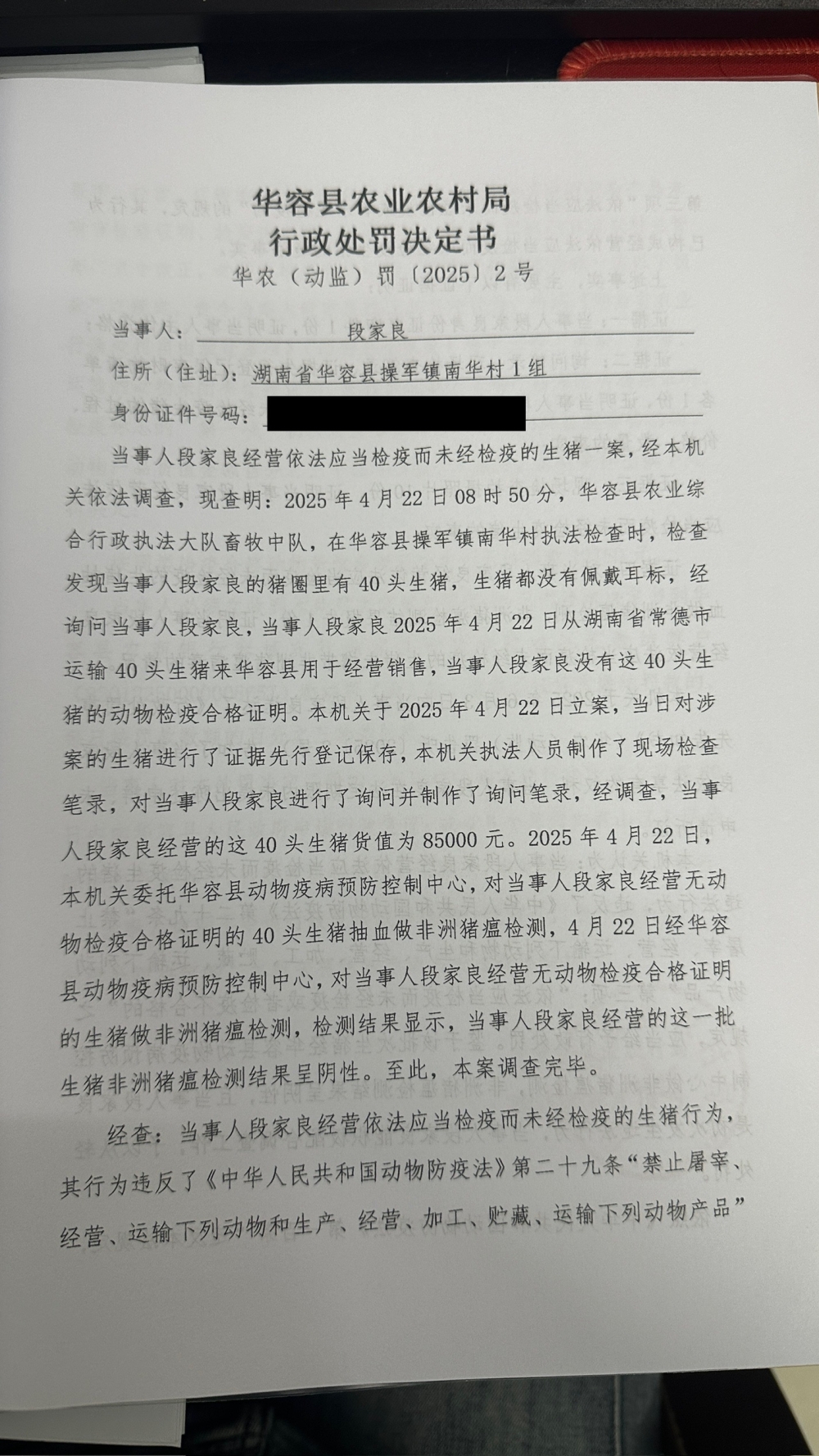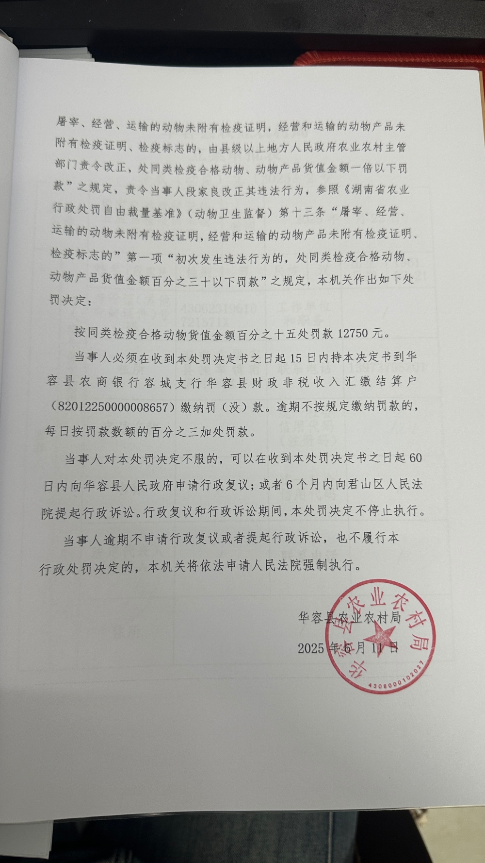 华容县农业农村局行政处罚决定书 华农(动监)罚〔2025〕2号