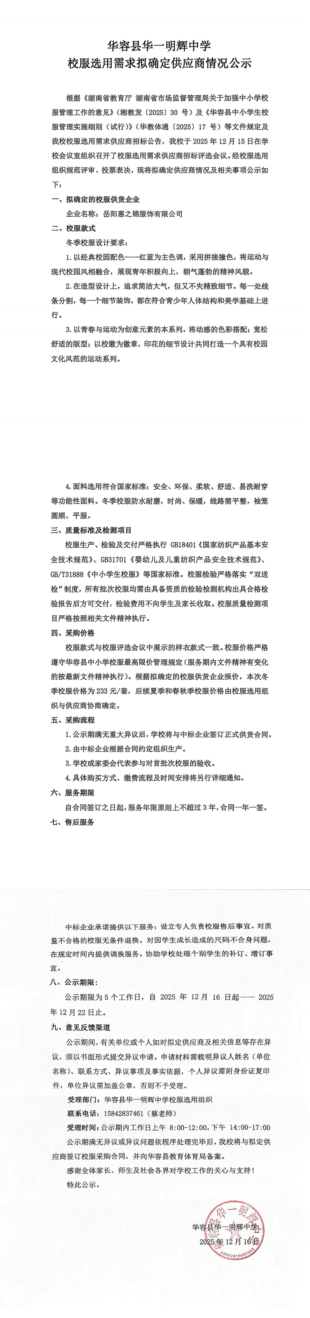 华容县华一明辉中学校服选用需求拟确定供应商情况公示