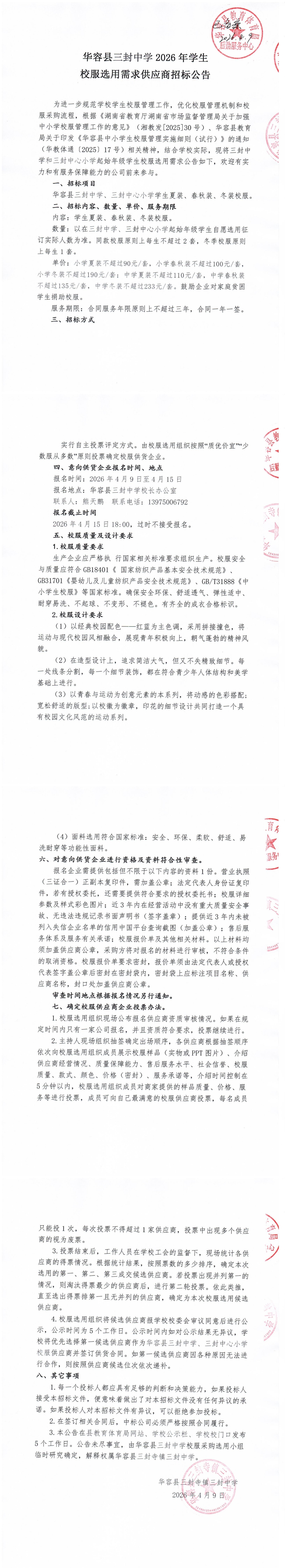 华容县三封中学2026年学生校服选用需求供应商招标公告.pdf