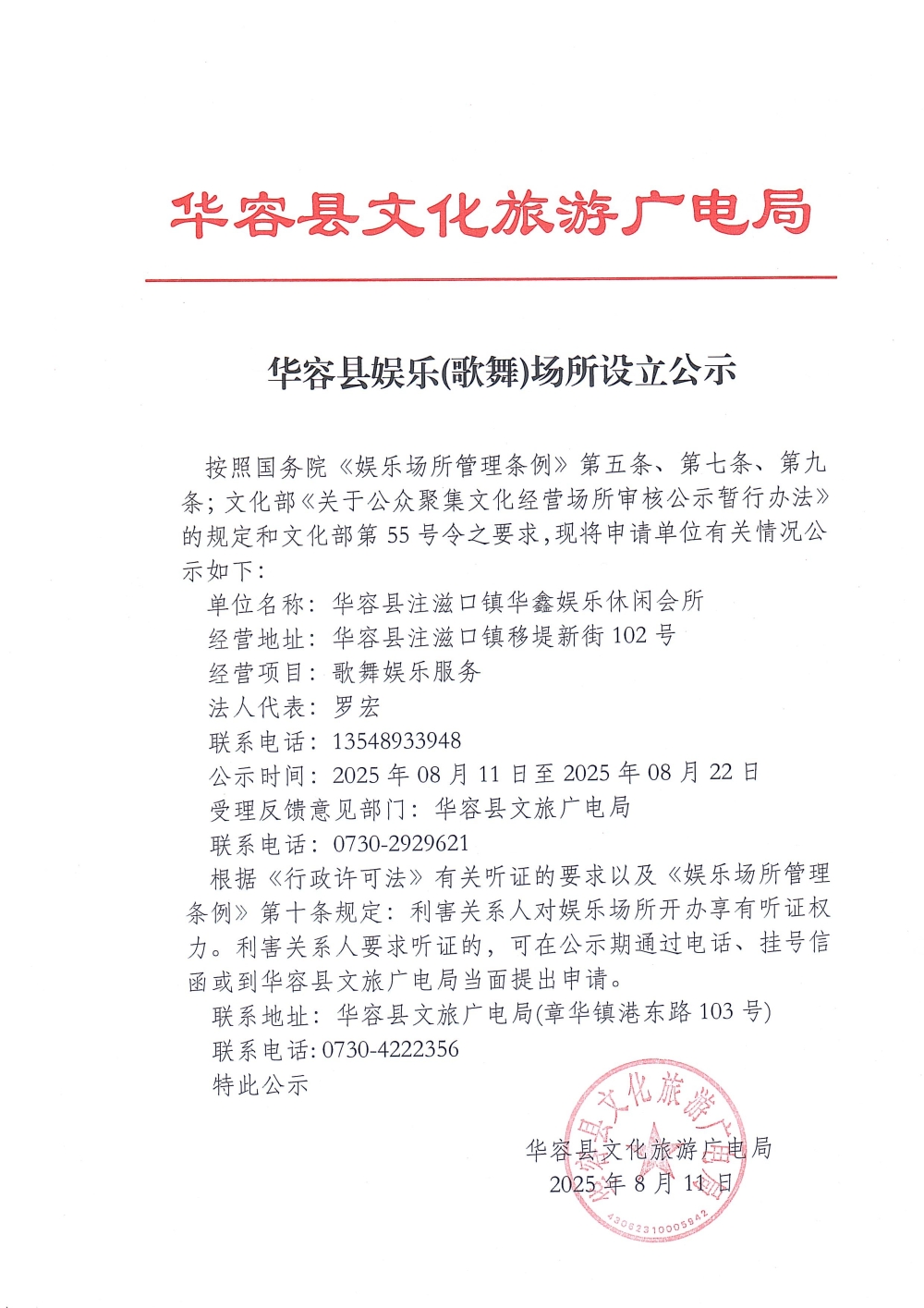 华容县娱乐(歌舞)场所设立公示