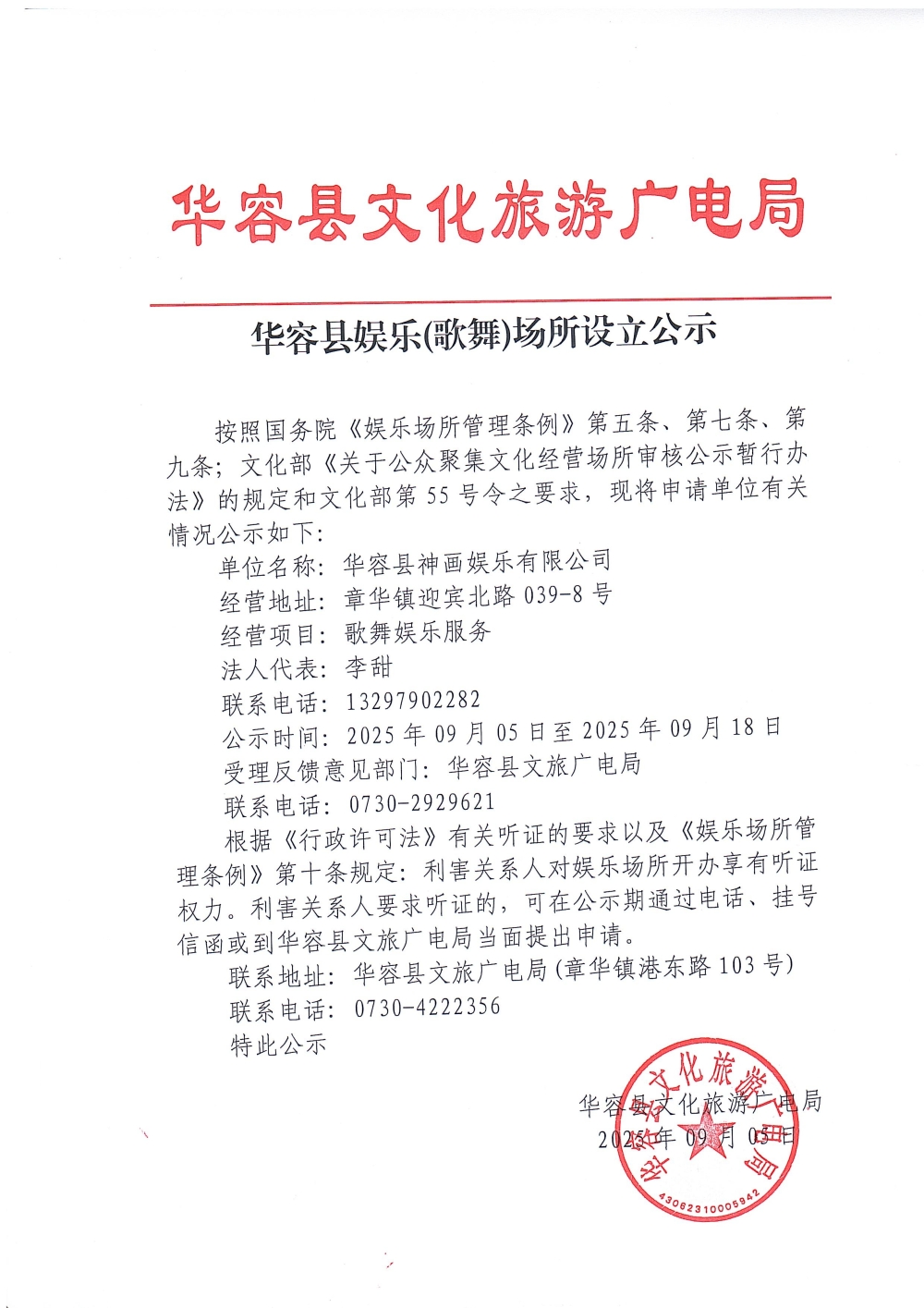 华容县娱乐(歌舞)场所设立公示