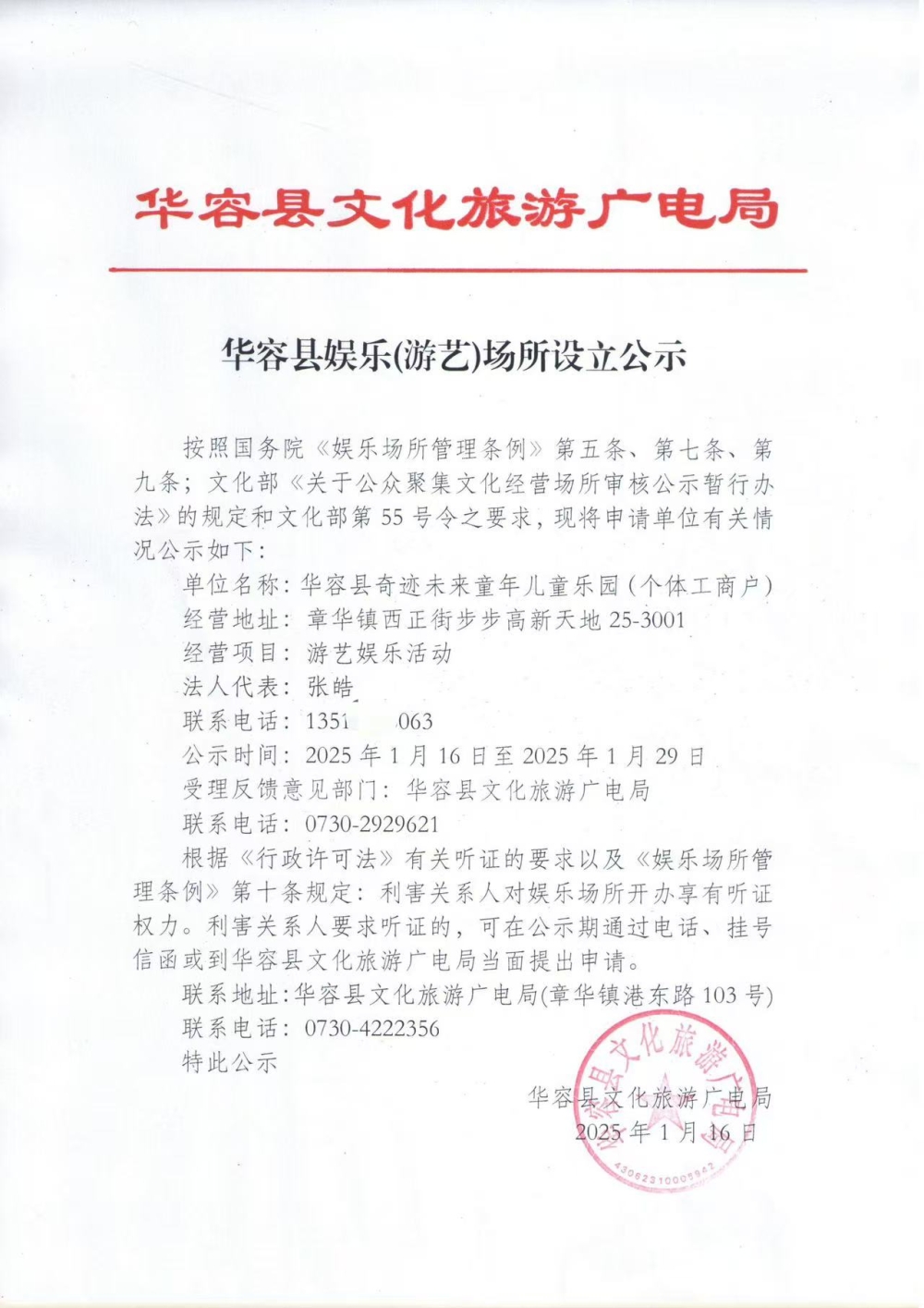 华容县奇迹未来童年乐园娱乐(游艺)场所设立公示