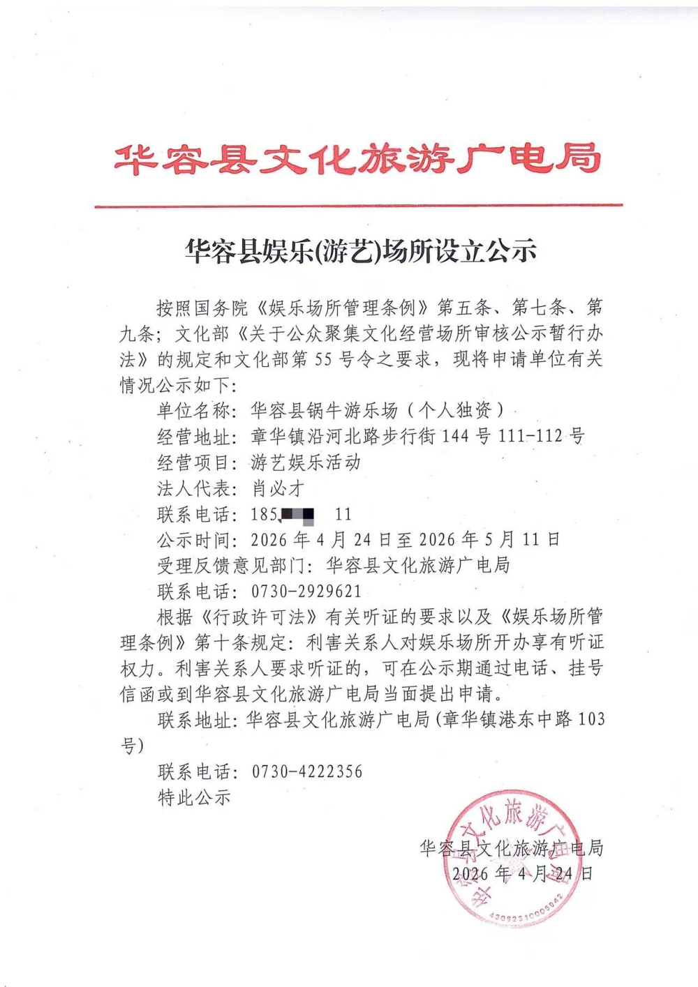 华容县娱乐(游艺)场所设立公示