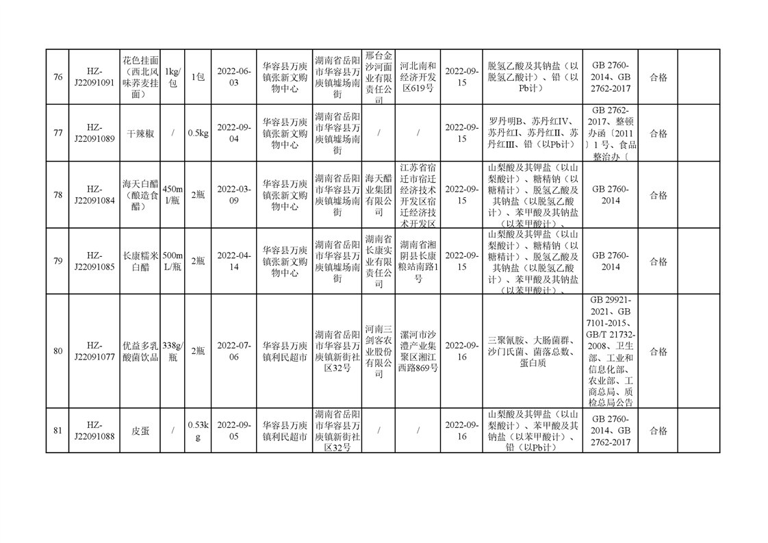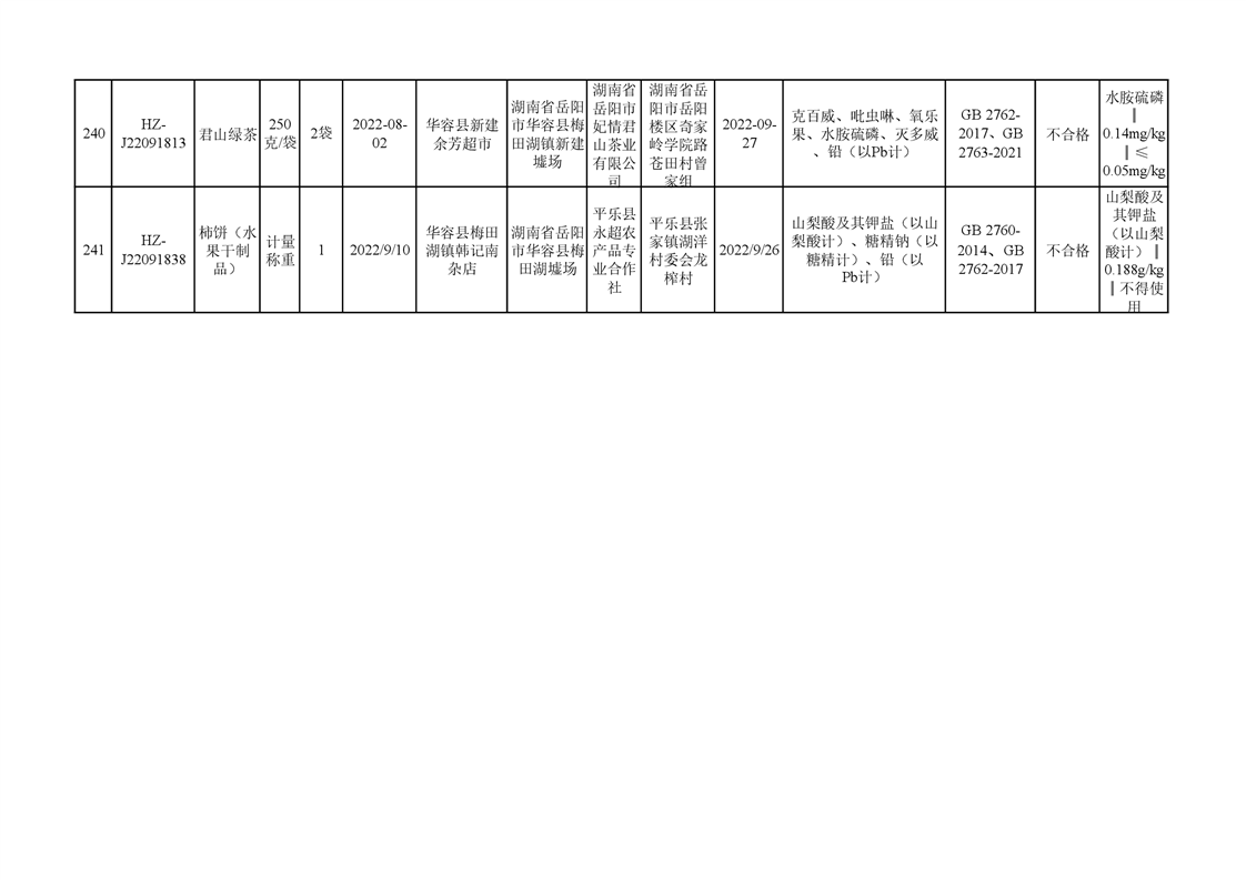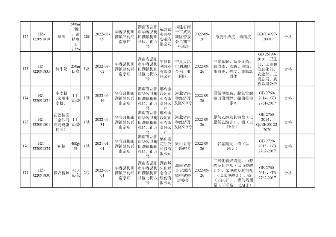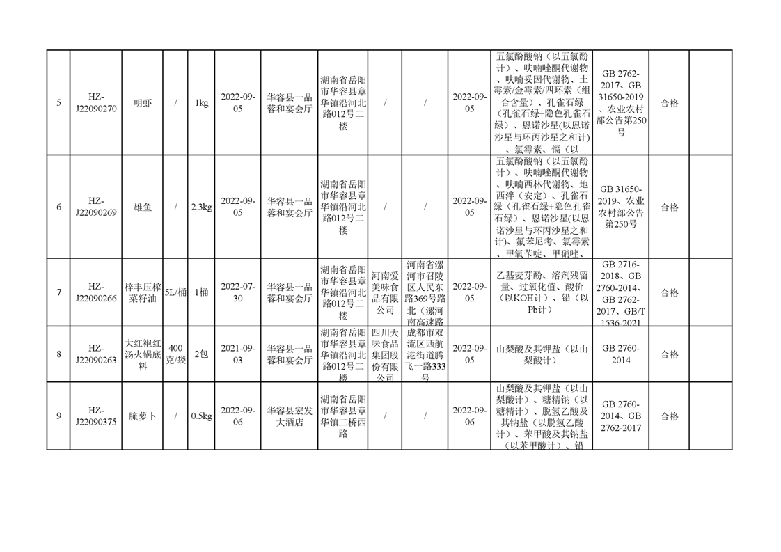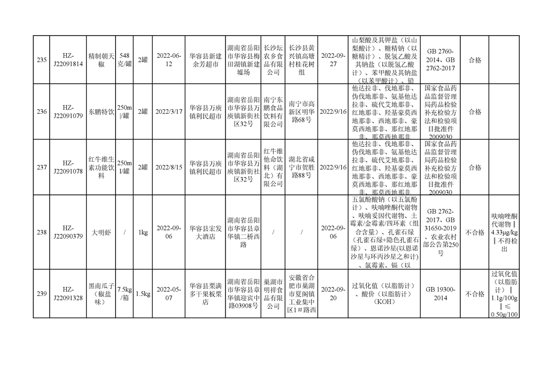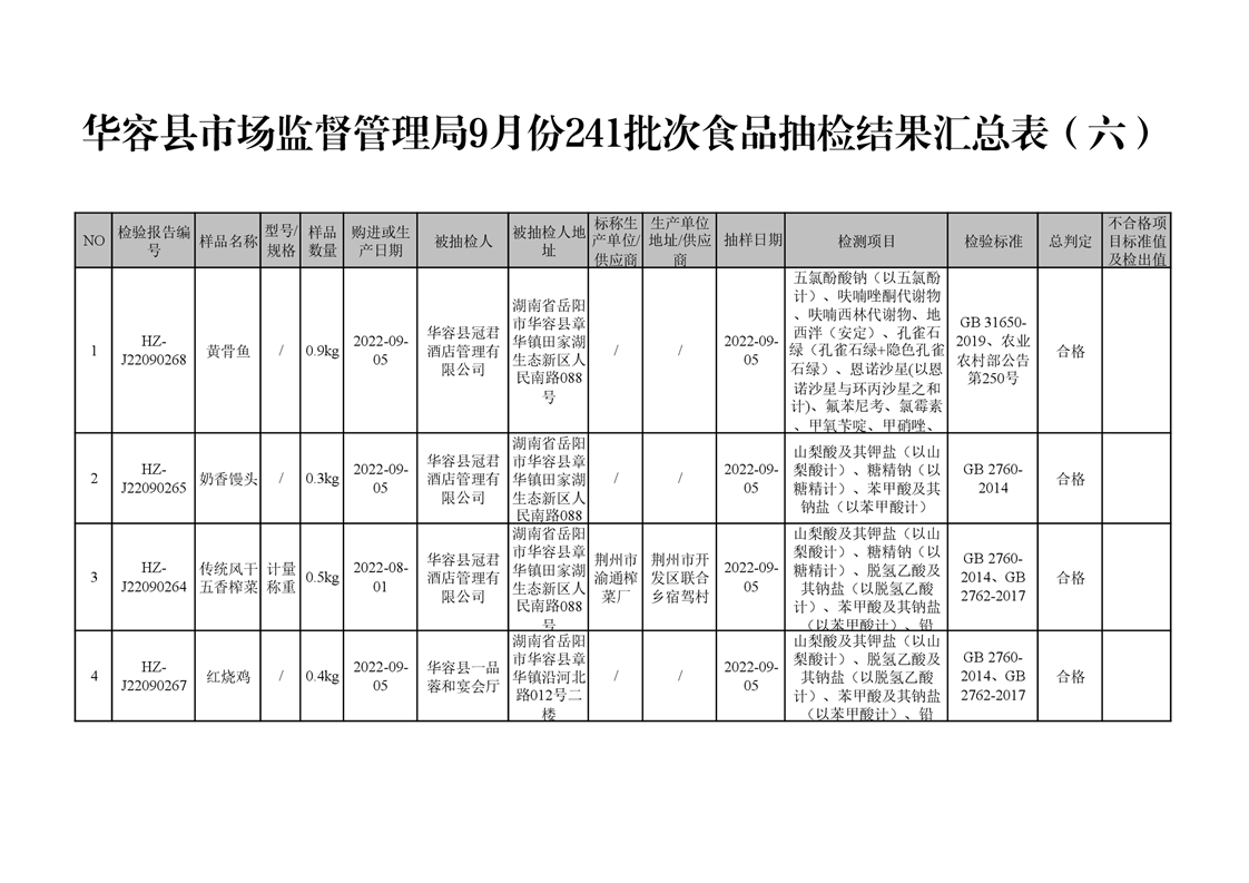 华容县市场监督管理局9月份241批次食品抽检结果汇总表(六)