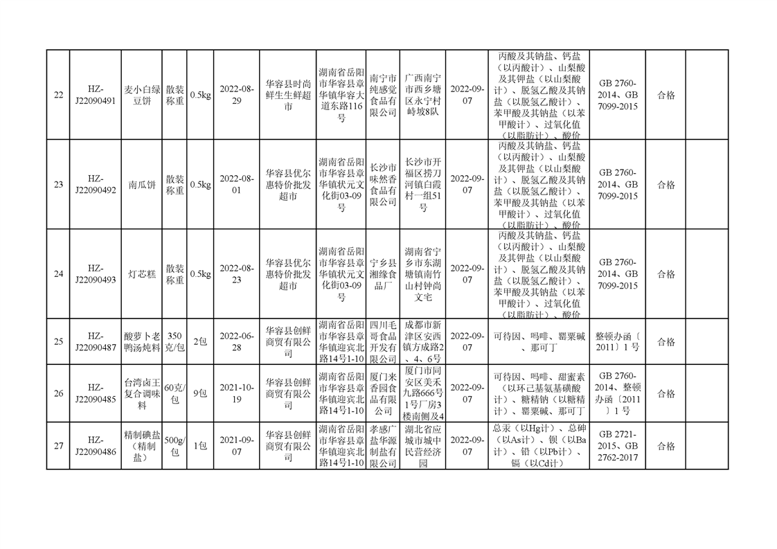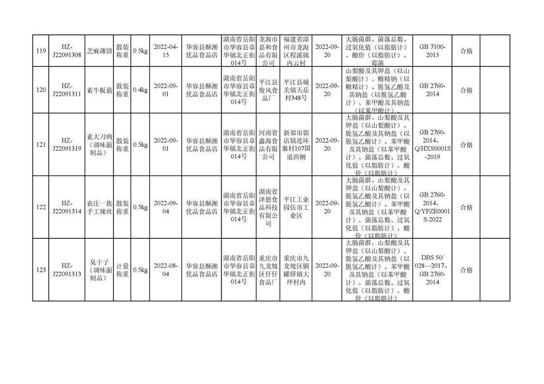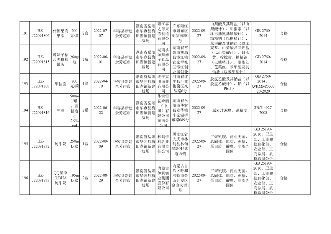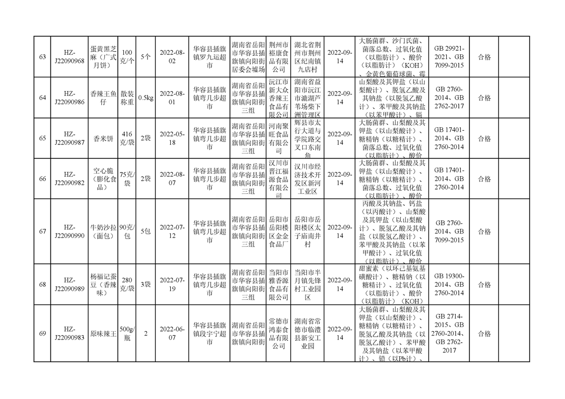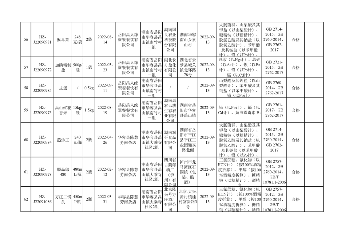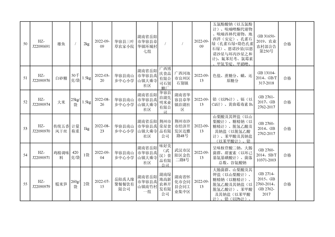 华容县市场监督管理局9月份241批次食品抽检结果汇总表(六)