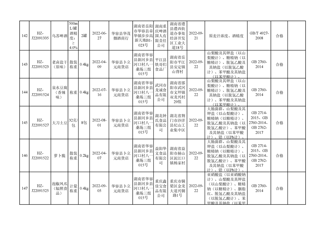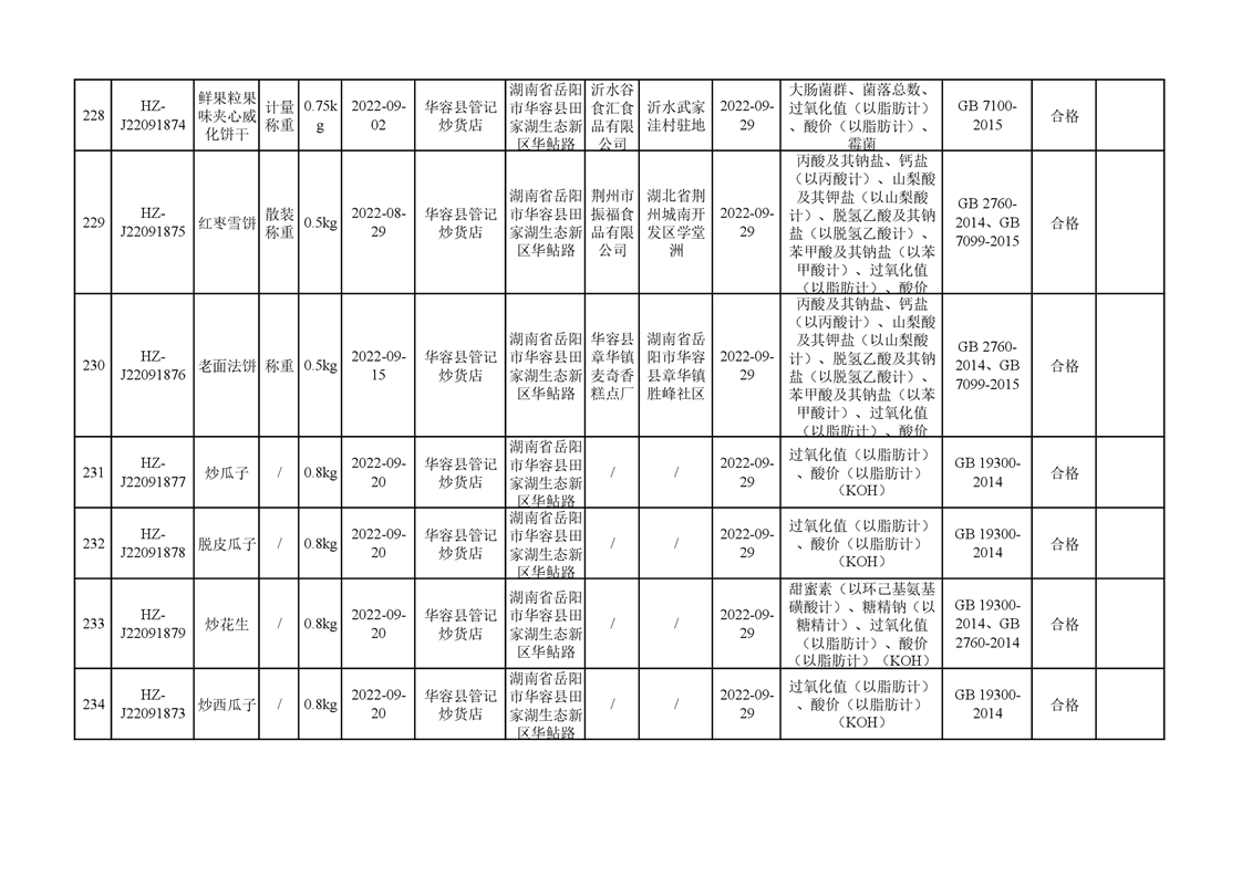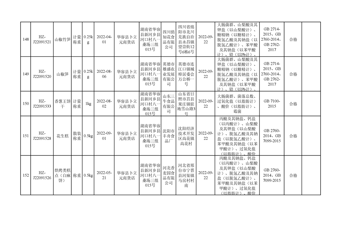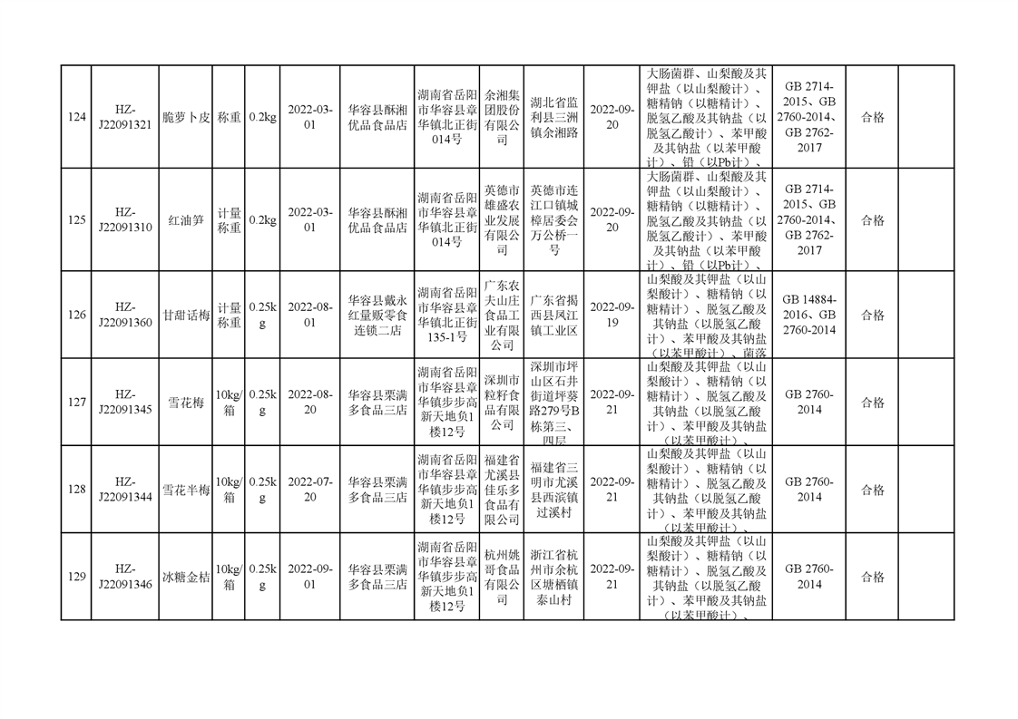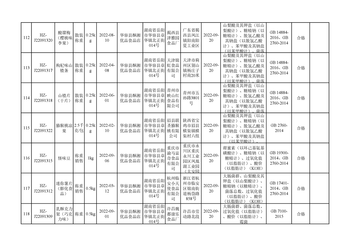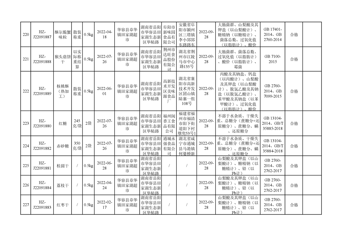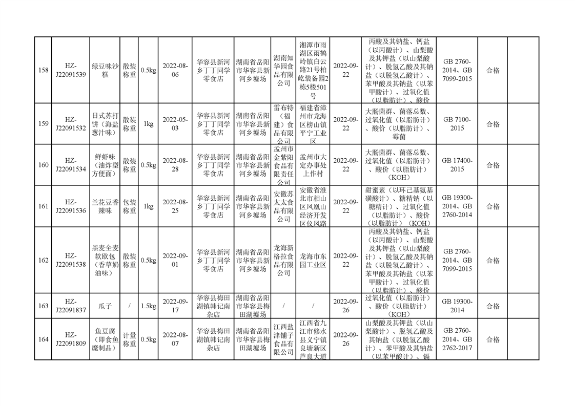 华容县市场监督管理局9月份241批次食品抽检结果汇总表(六)