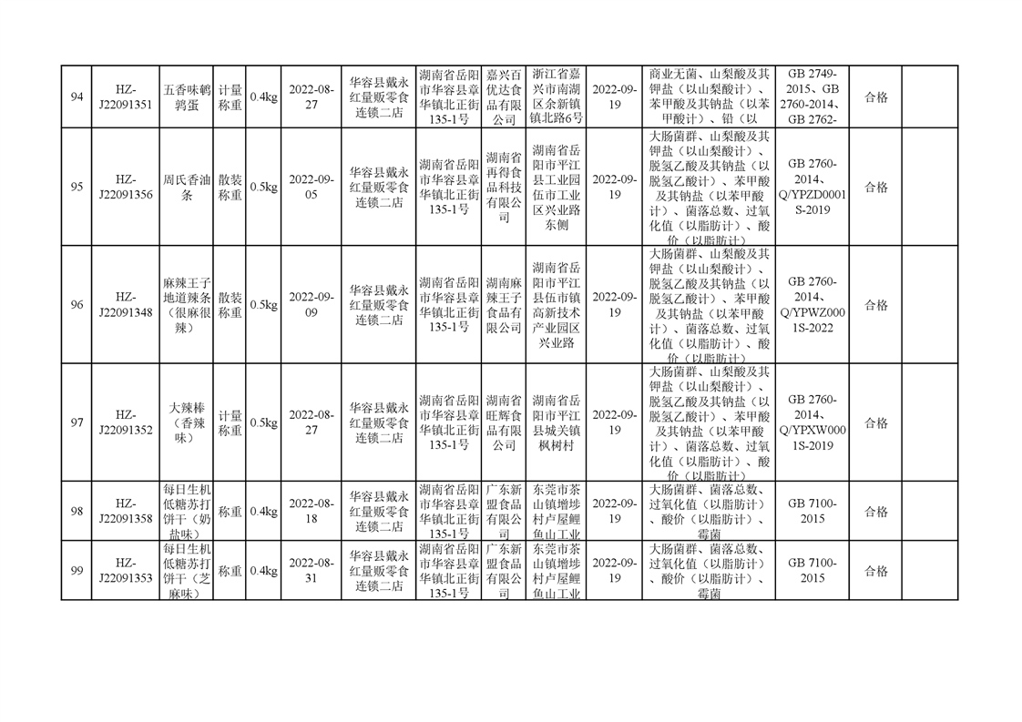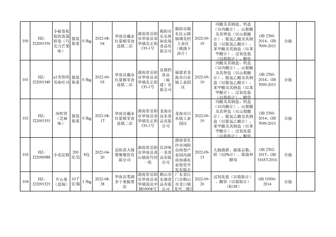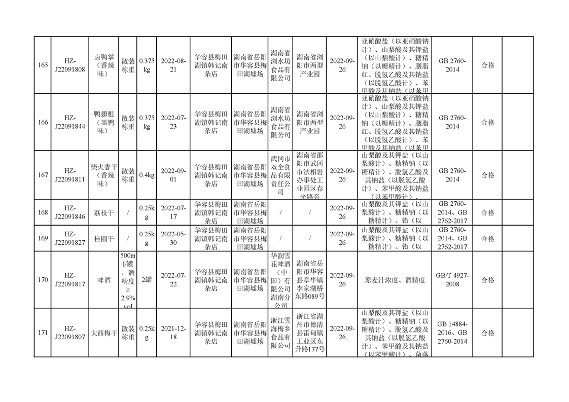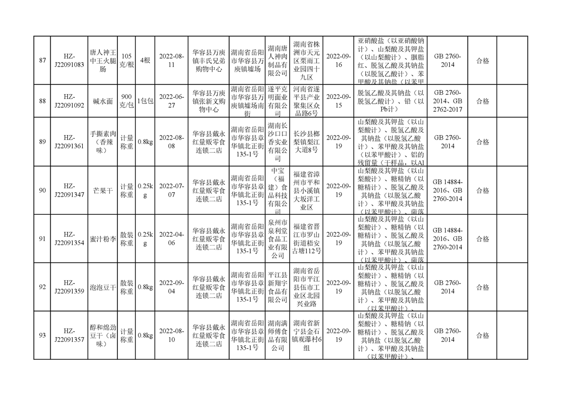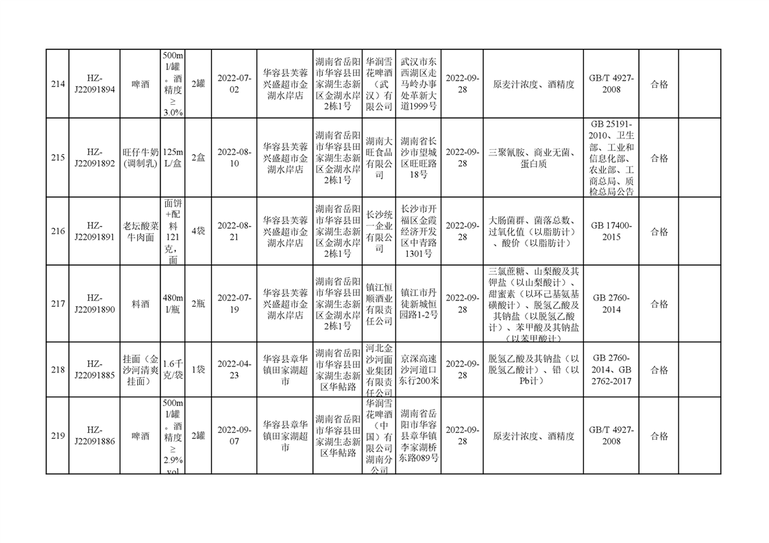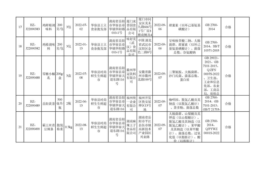 华容县市场监督管理局9月份241批次食品抽检结果汇总表(六)