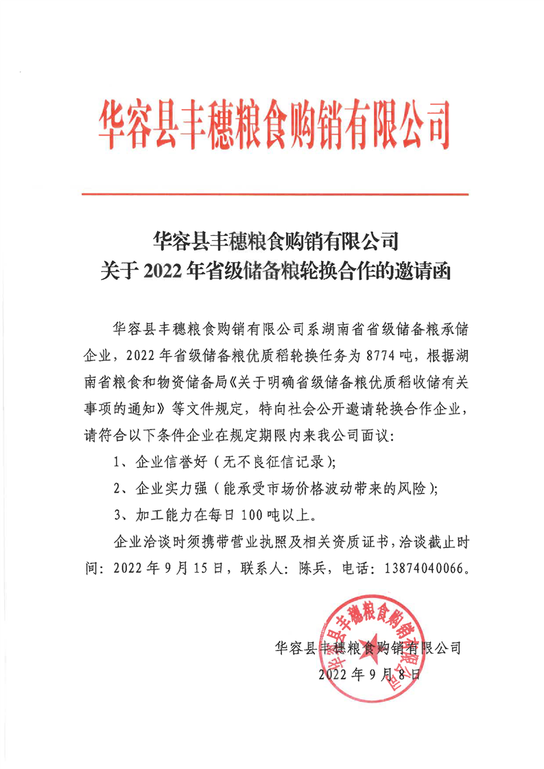 华容县丰穗粮食购销有限公司关于2022年省级储备粮轮换合作的邀请函