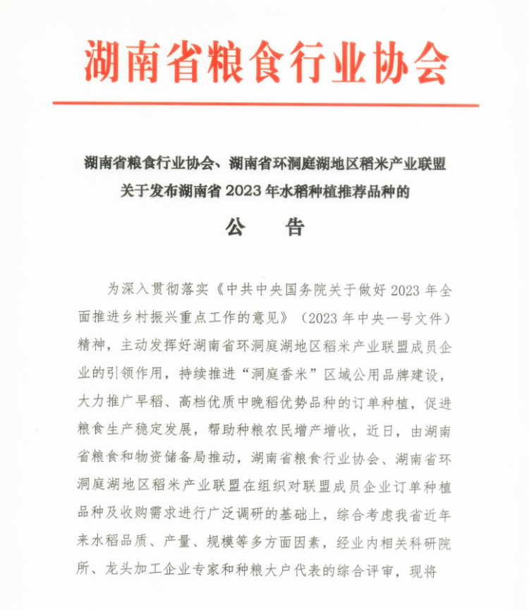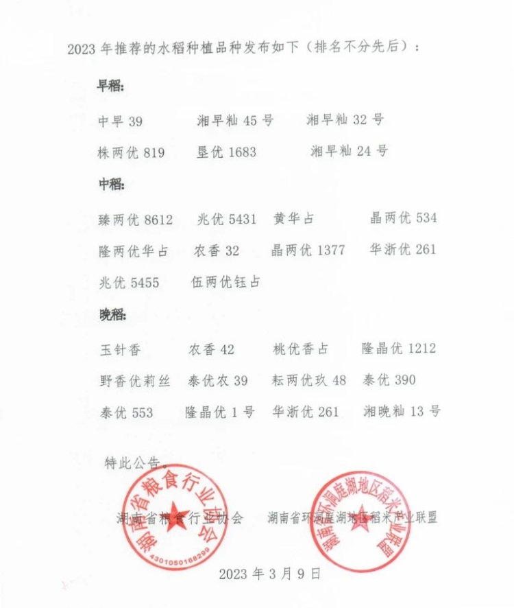 关于发布湖南省2023年水稻种植推荐品种的公告