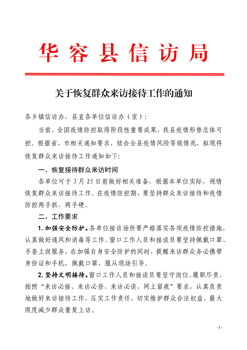 关于恢复群众来访接待工作的通知