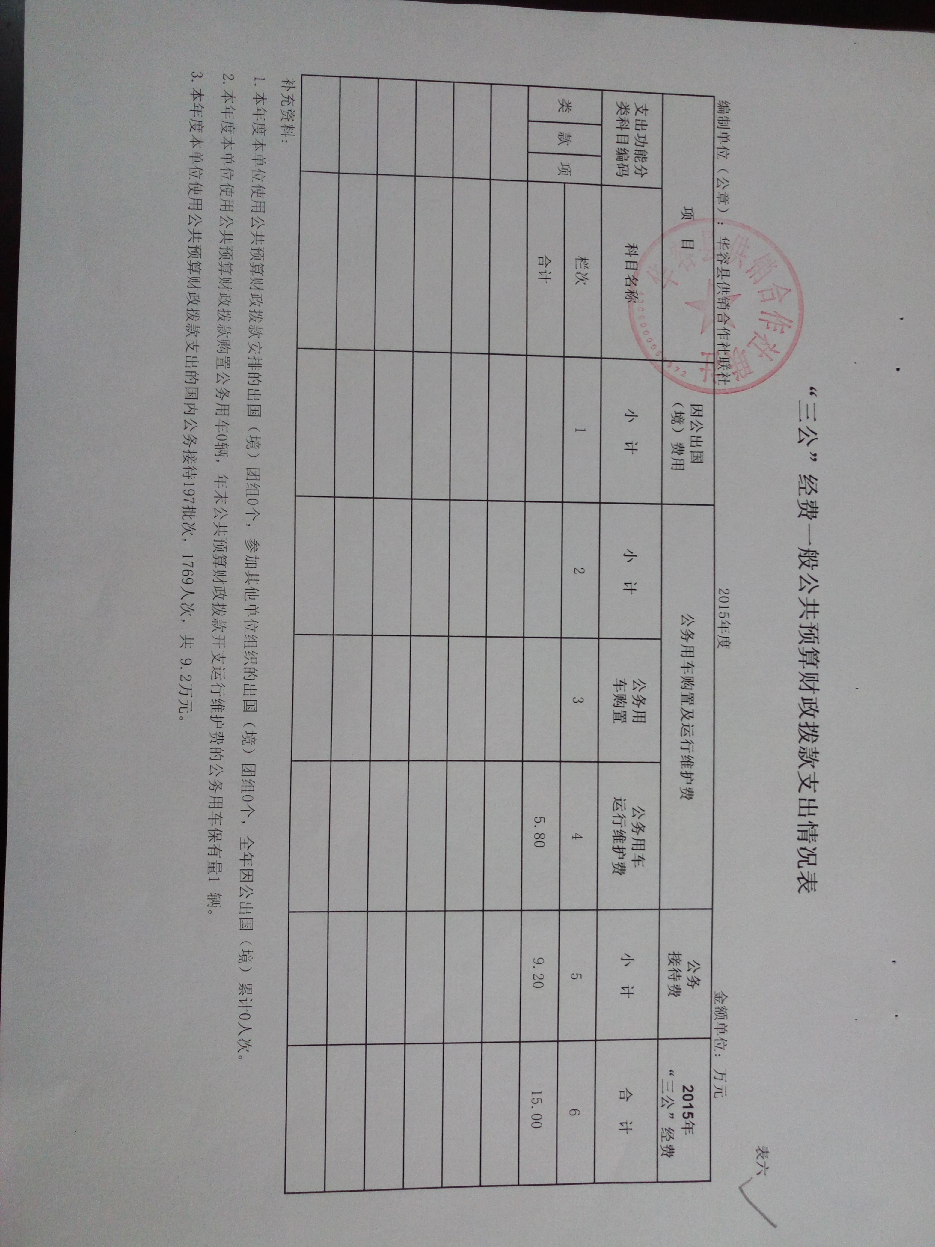2015年度华容县供销联社“三公”经费一般公共预算财政拨款支出情况表