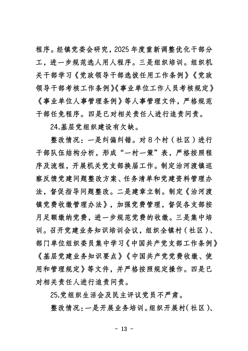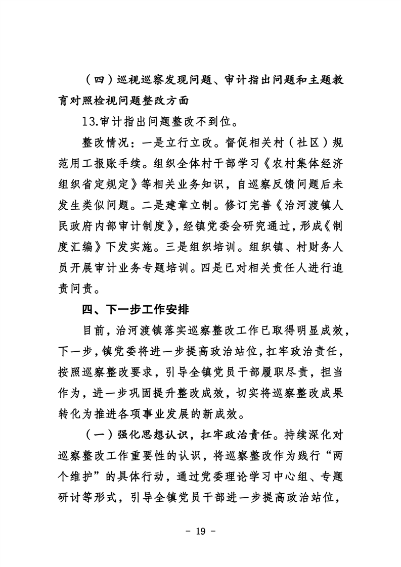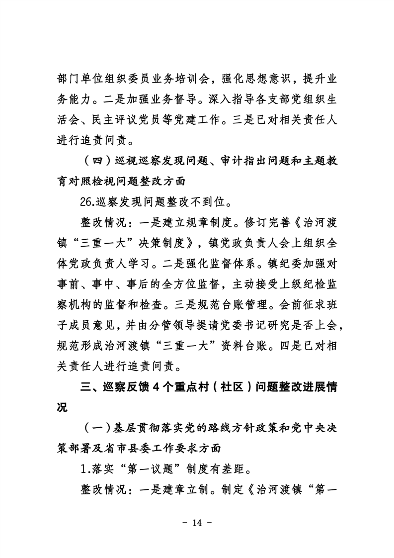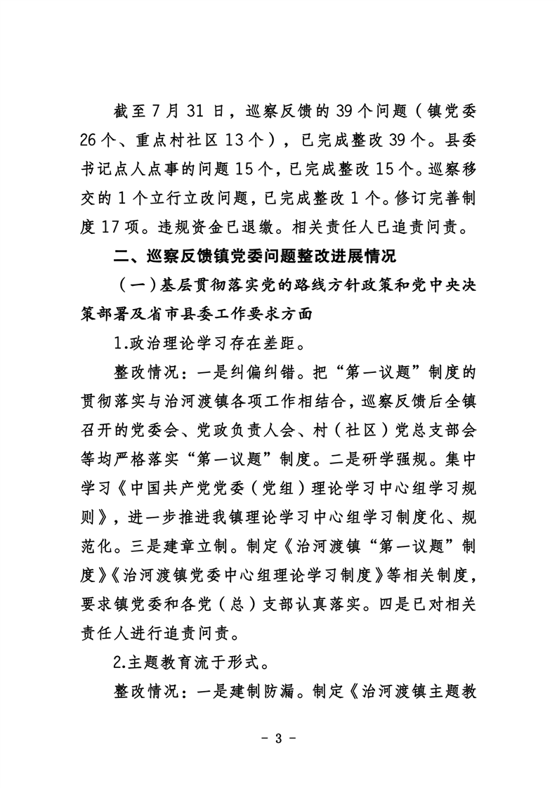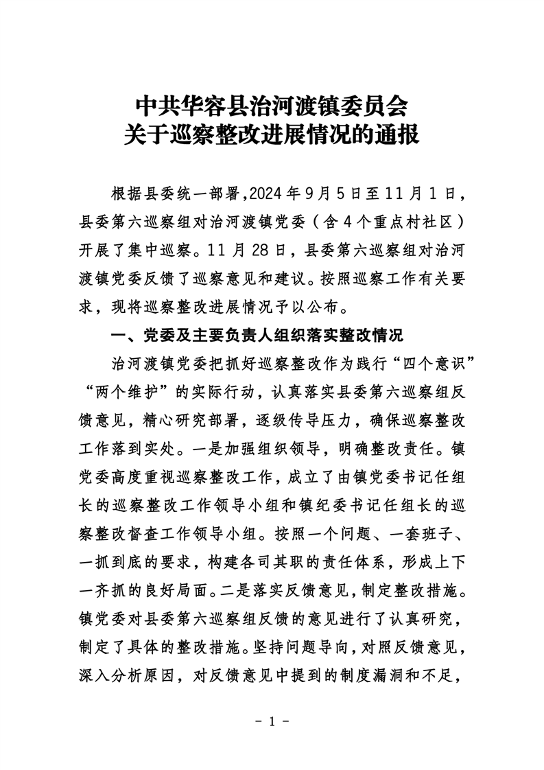 中共华容县治河渡镇委员会关于巡察整改进展情况的通报