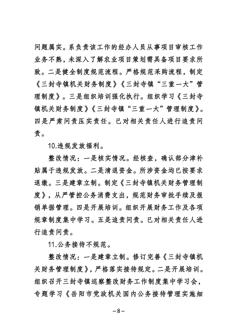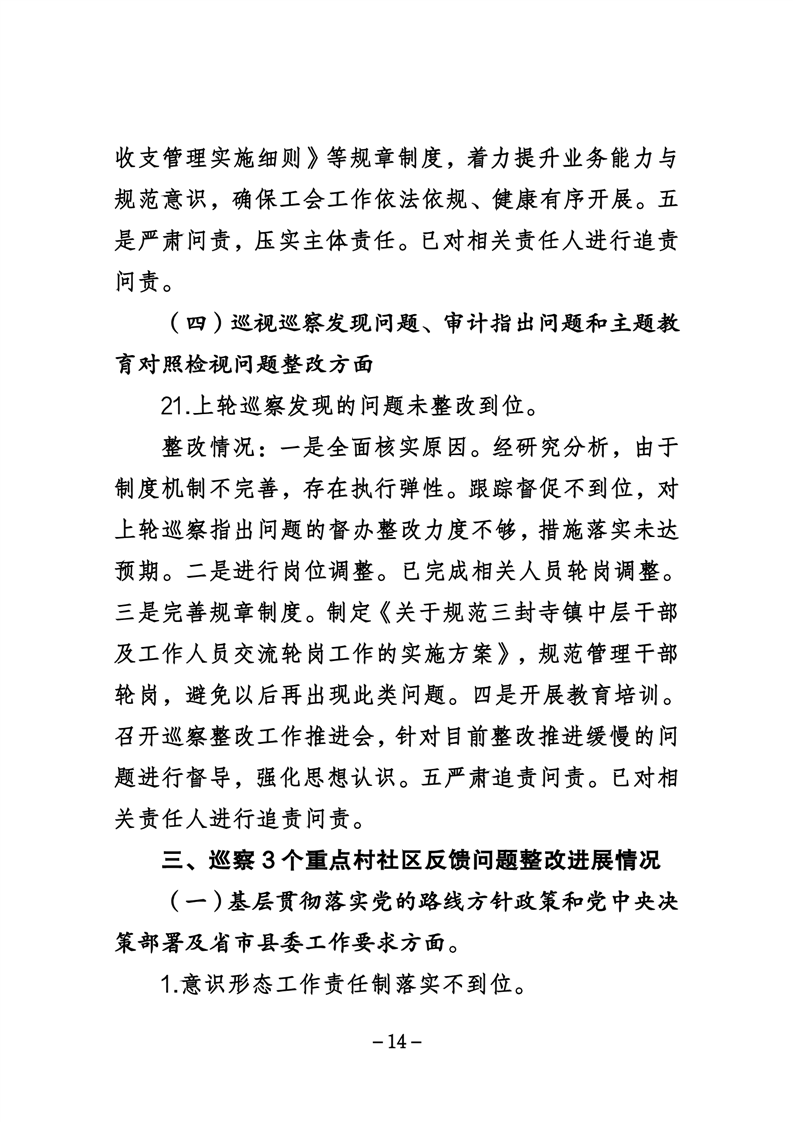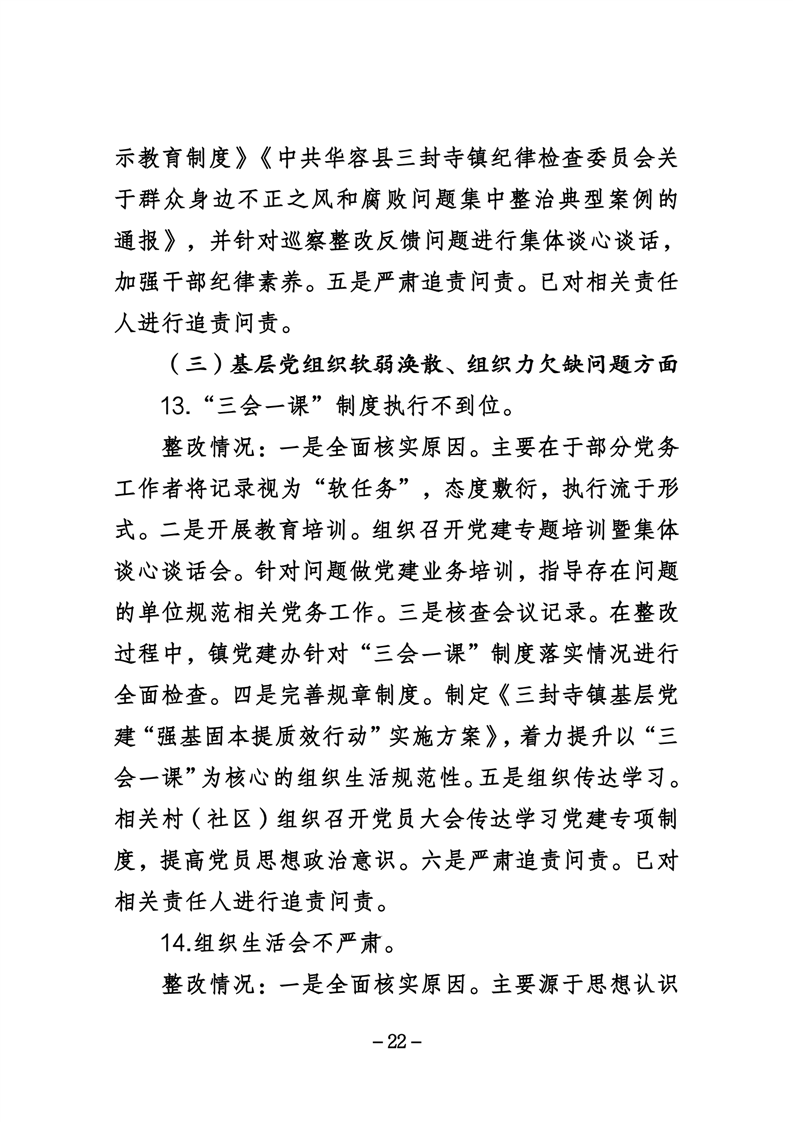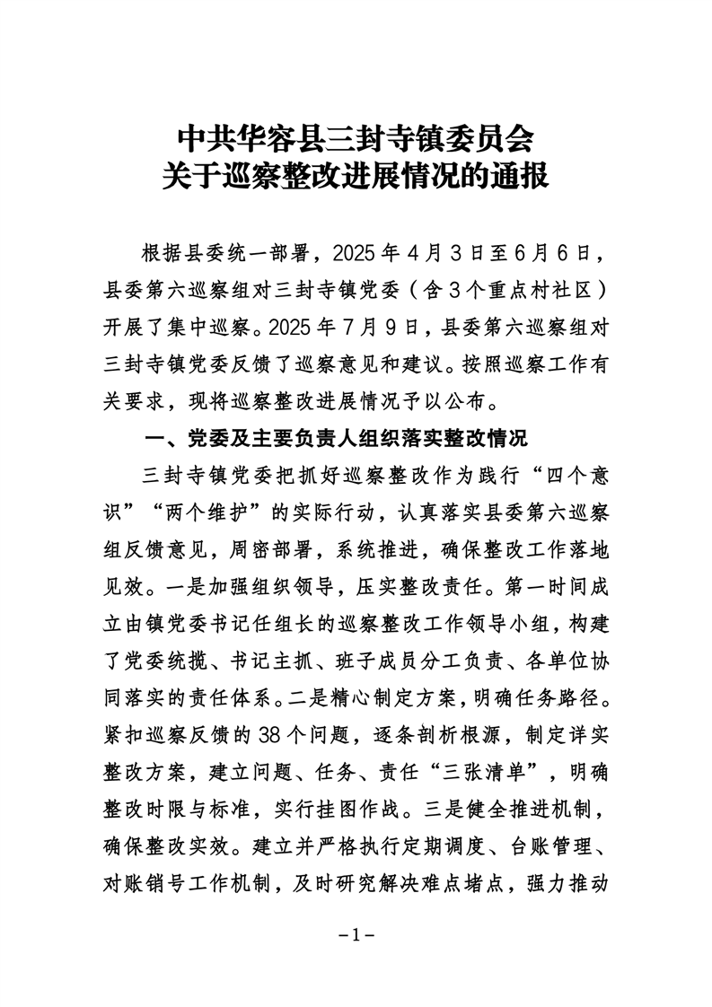 中共华容县三封寺镇委员会关于巡察整改进展情况的通报