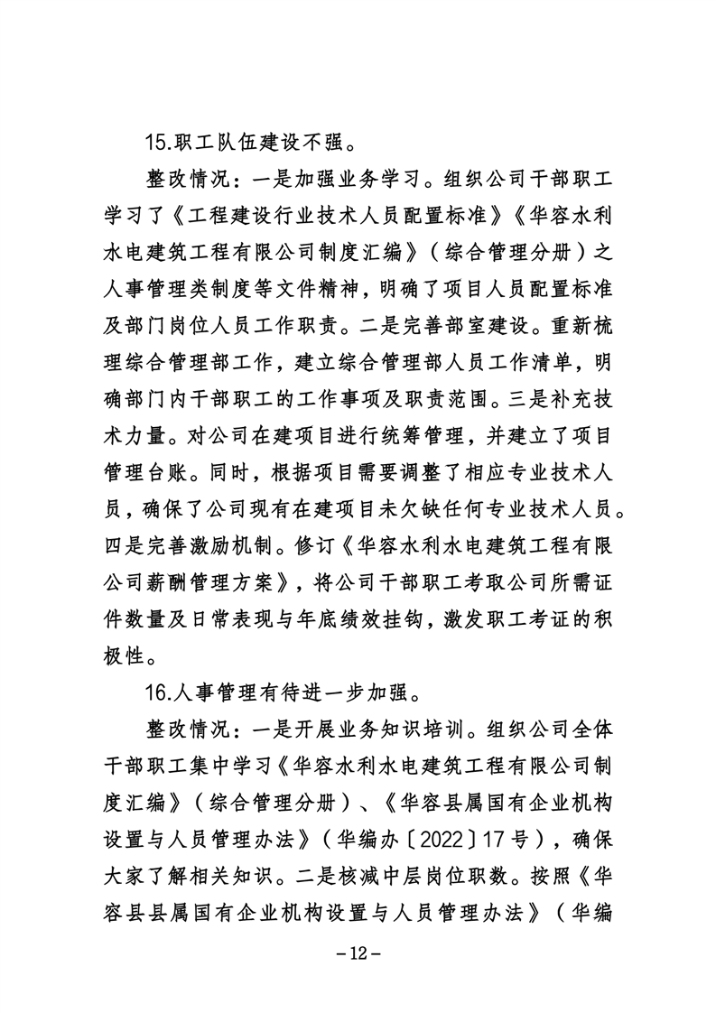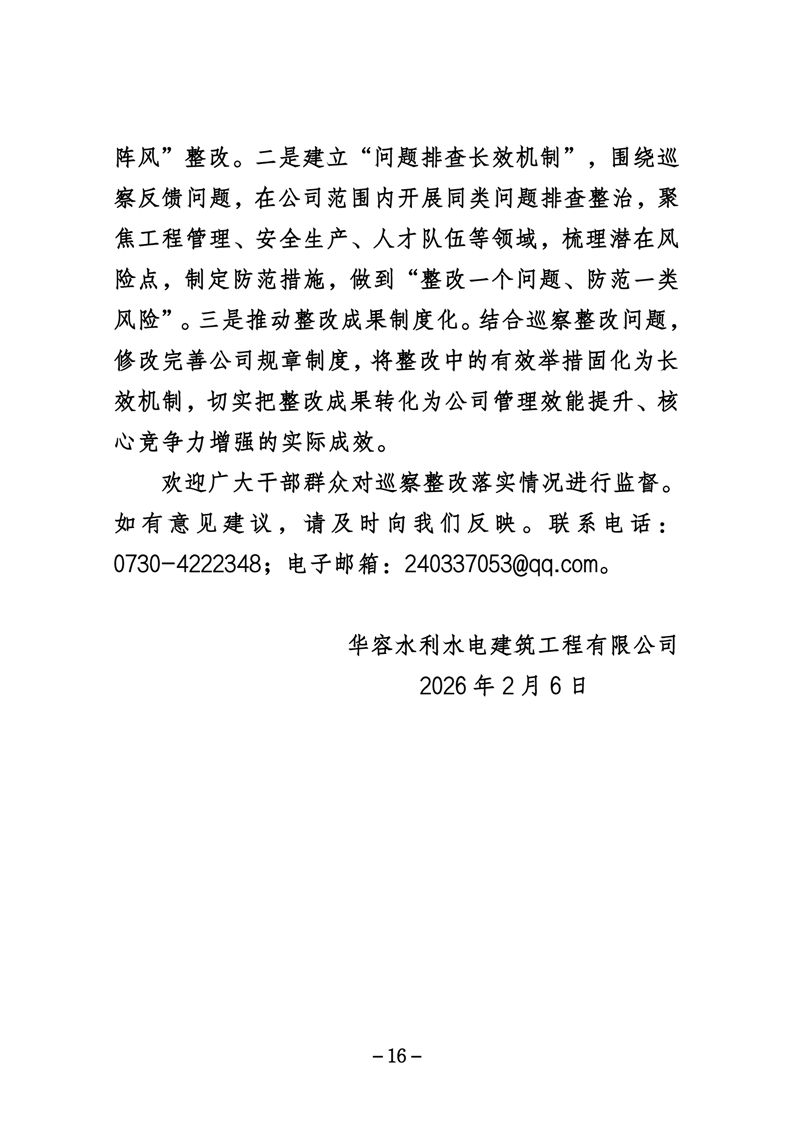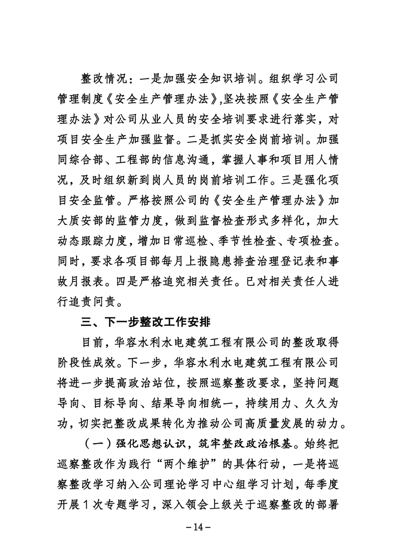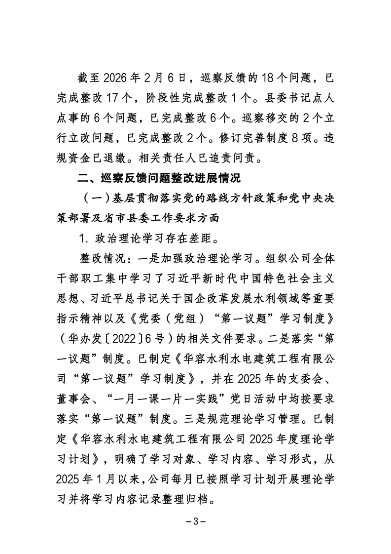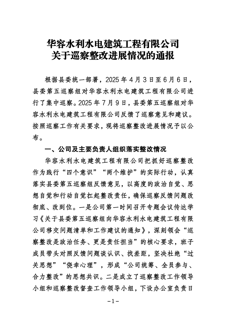 华容水利水电建筑工程有限公司关于巡察整改进展情况的通报