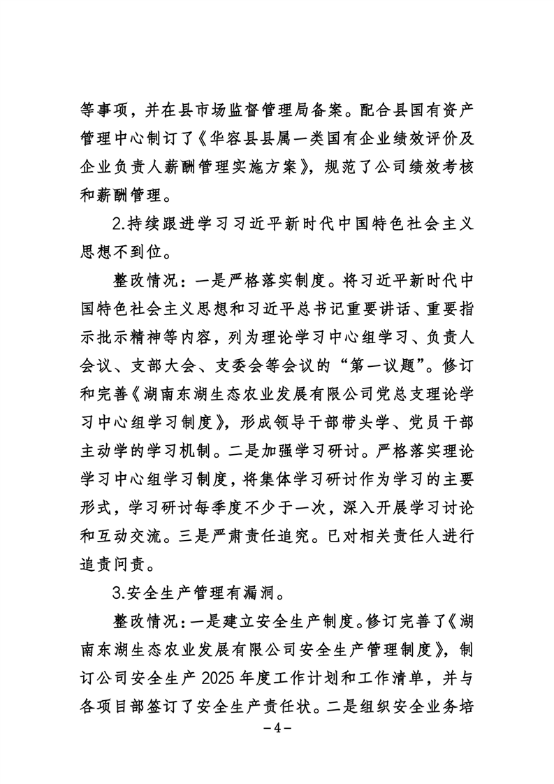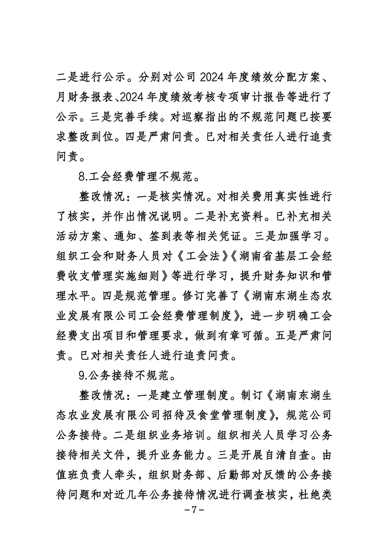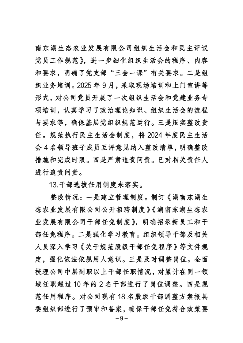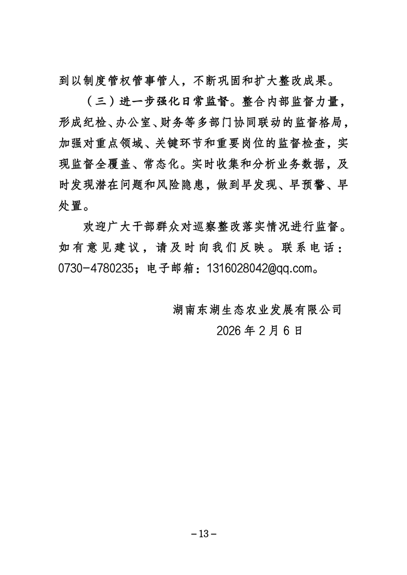 湖南东湖生态农业发展有限公司关于巡察整改进展情况的通报