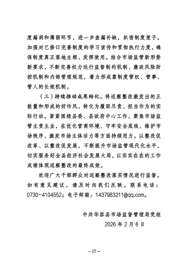 中共华容县市场监督管理局党组关于巡察整改进展情况的通报