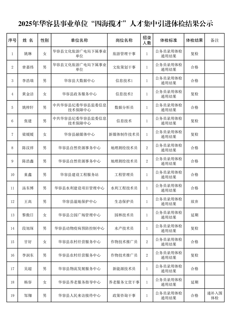 2025年华容县事业单位“四海揽才”人才集中引进体检结果公示