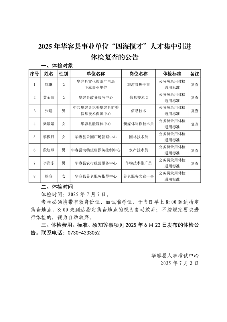 2025年华容县事业单位“四海揽才”人才集中引进体检复查的公告