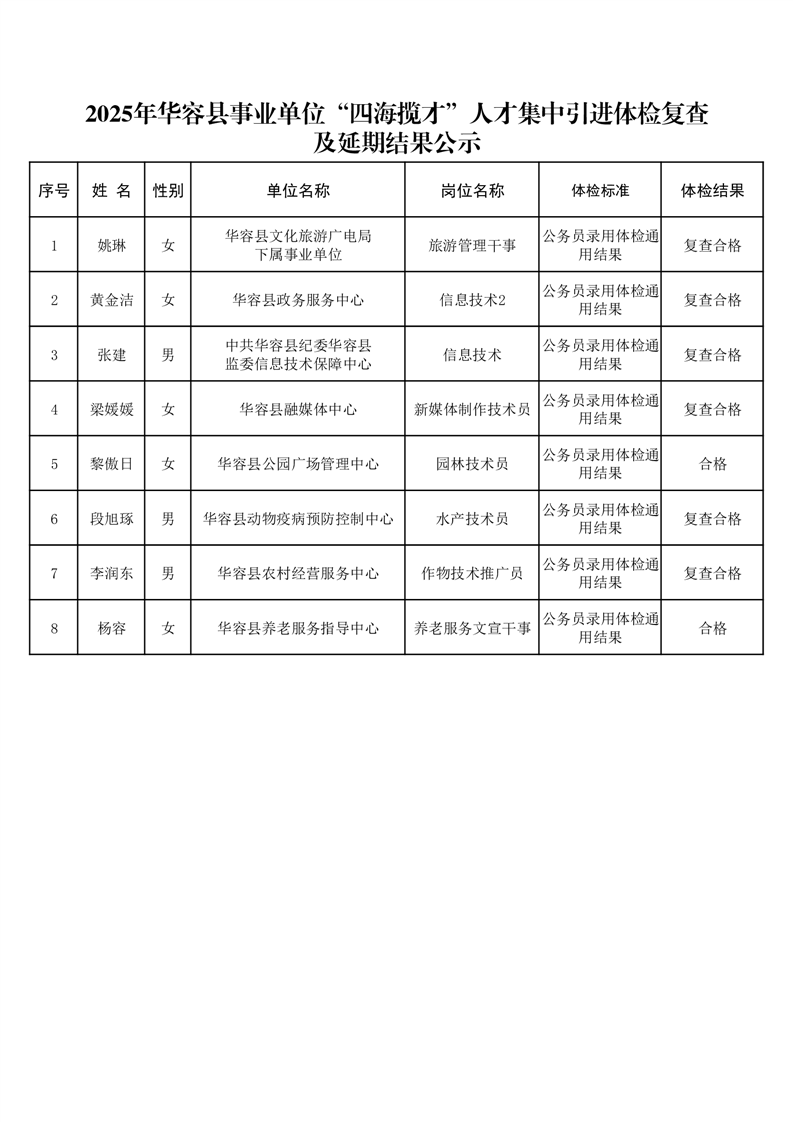 2025年华容县事业单位“四海揽才”人才集中引进体检复查及延期结果公示