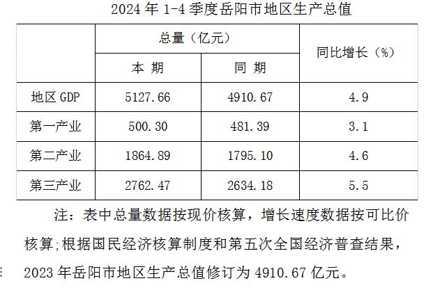 根据地区生产总值统一核算结果,2024年1-4季度岳阳市地区生产总值5127.66亿元,按可比价格计算,同比增长4.9%。分产业看,第一产业增加值500.30亿元,增长3.1%;第二产业增加值1864.89亿元,增长4.6%;第三产业增加值2762.47亿元,增长5.5%。