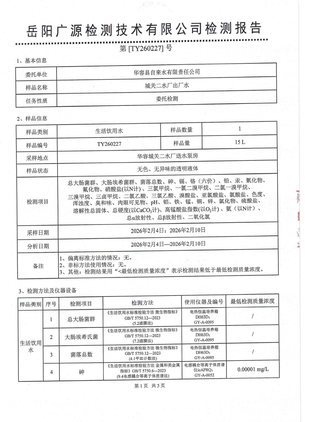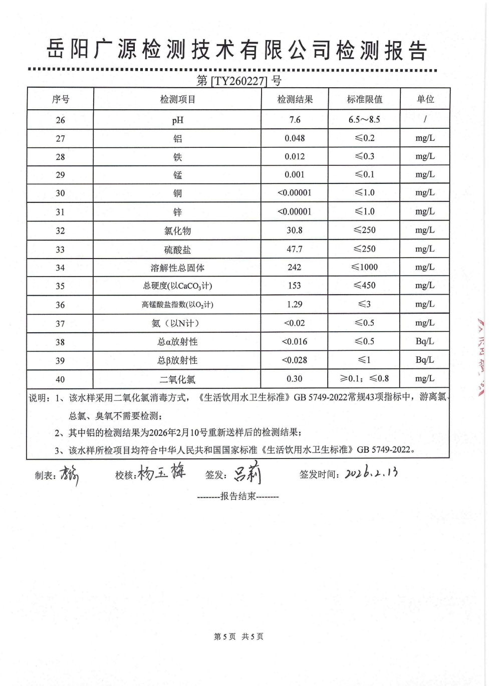 2026年2月水质来样检测报告(出厂水)