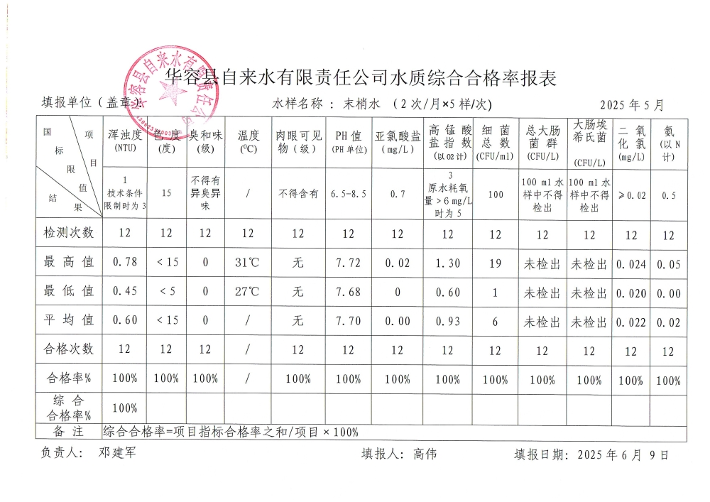 华容县自来水公司2025年5月末梢水水质综合合格率报表