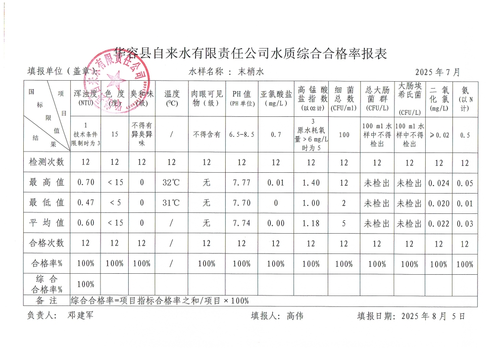 华容县自来水公司2025年7月末梢水水质综合合格率报表