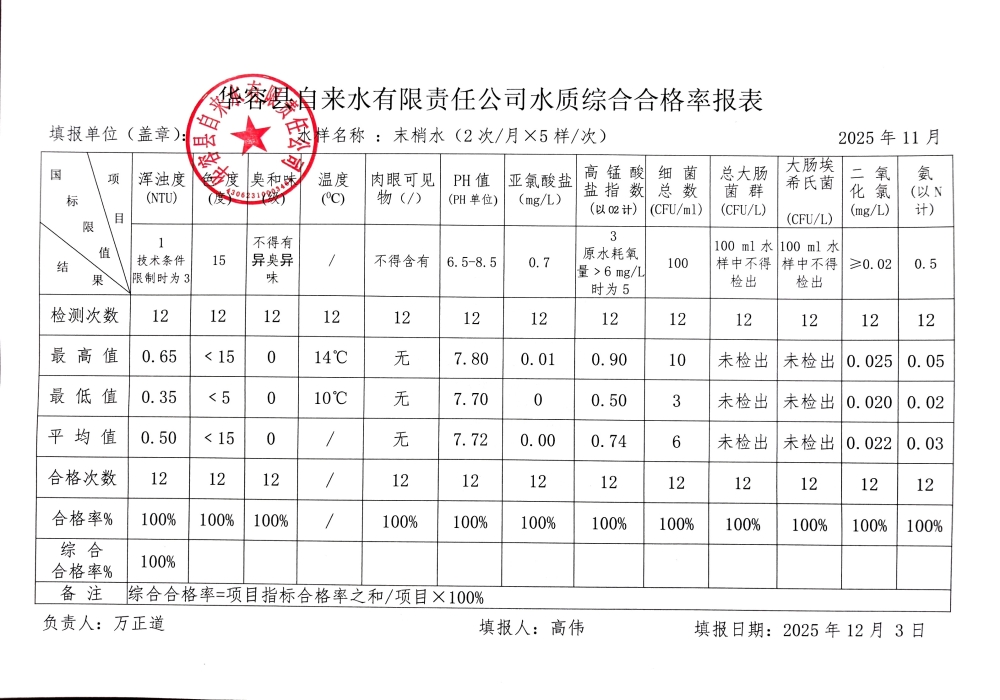华容县自来水公司2025年11月末梢水水质综合合格率报表