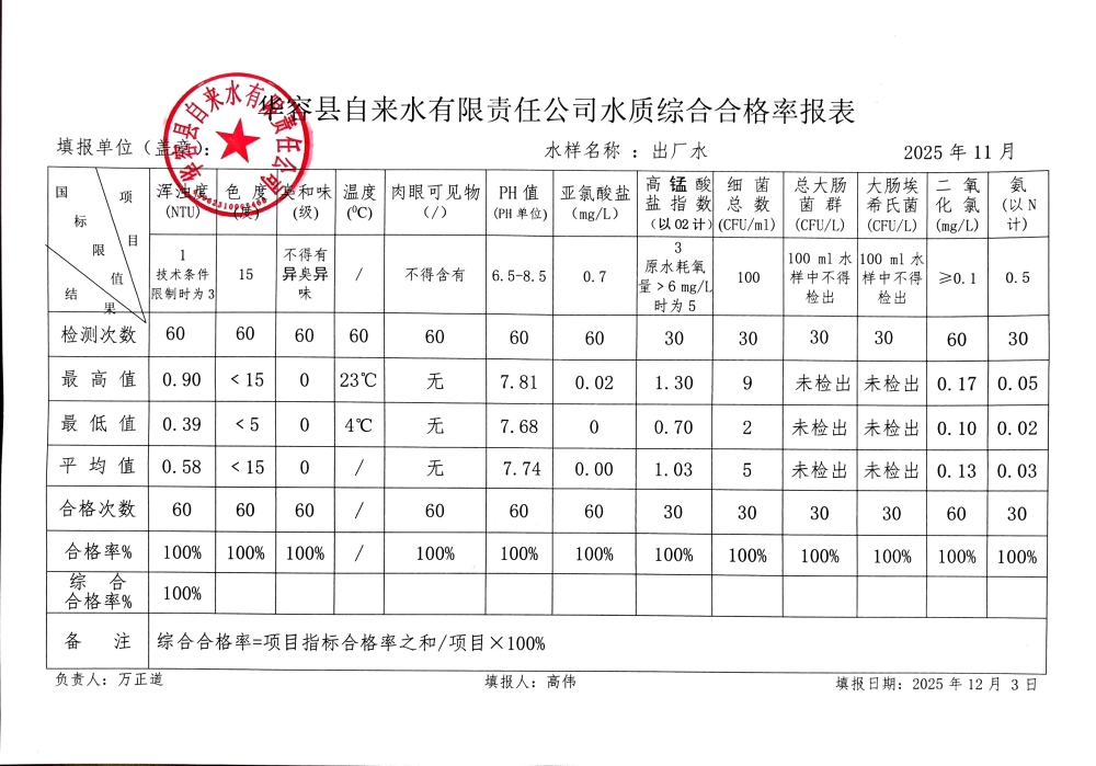 华容县自来水公司2025年11月出厂水水质综合合格率报表