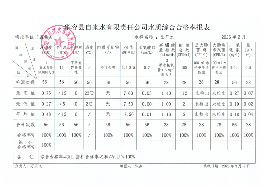 华容县自来水公司2026年2月出厂水水质综合合格率报表