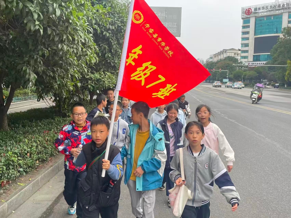 同学们首先在学校操场集合,强调活动纪律和安全注意事项,清点人数后,各班举班旗排两纵队从章华学校东校门出发,途经育才巷、纱厂、二大桥、书院路、妇幼保健院等地,过斑马线到终点--职业中专学校,全程往返10余公里。一路上,同学们说说笑笑,拉歌呼应,口号比拼,热闹又不失整饬。体弱走不动的,有帮拿东西的,有牵拉陪伴的,有鼓气加油的。全体同学真正做到“不落一人,不弃一物”。