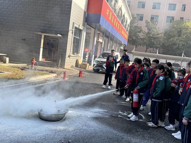 掌握了基础知识后,消防员为师生们带来了一堂“干货满满”的灭火技能课。他们详细示范了灭火器的正确操作步骤,并强调了“提、拔、握、压”的使用口诀。在消防员的监护下,学生们轮流拿起灭火器,成功完成了油盆灭火任务,将理论知识与实践操作紧密结合。