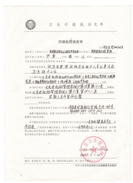 2021华卫医罚字决定书公示2021〔2021〕002号