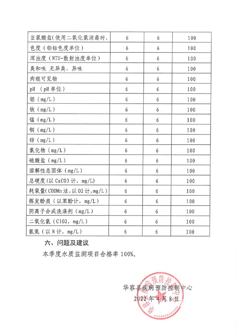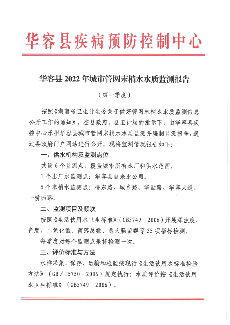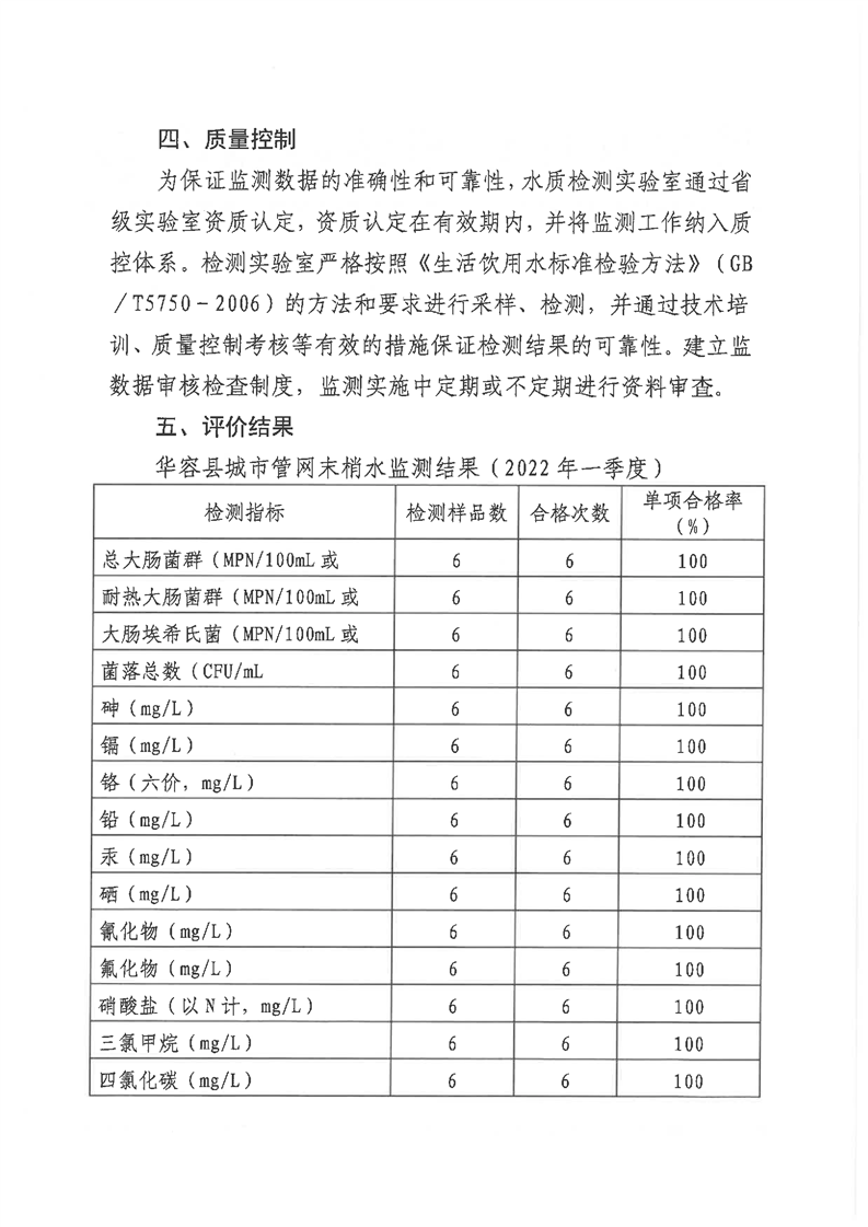 华容县2022年城市管网末梢水水质监测报告 (第一季度)