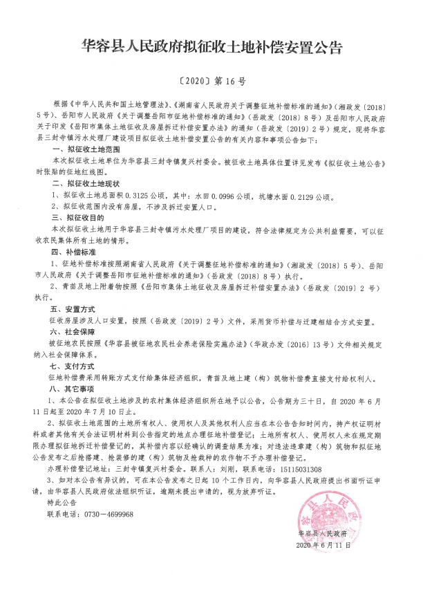 华容县三封寺镇污水处理厂建设项目征地补偿安置方案公告