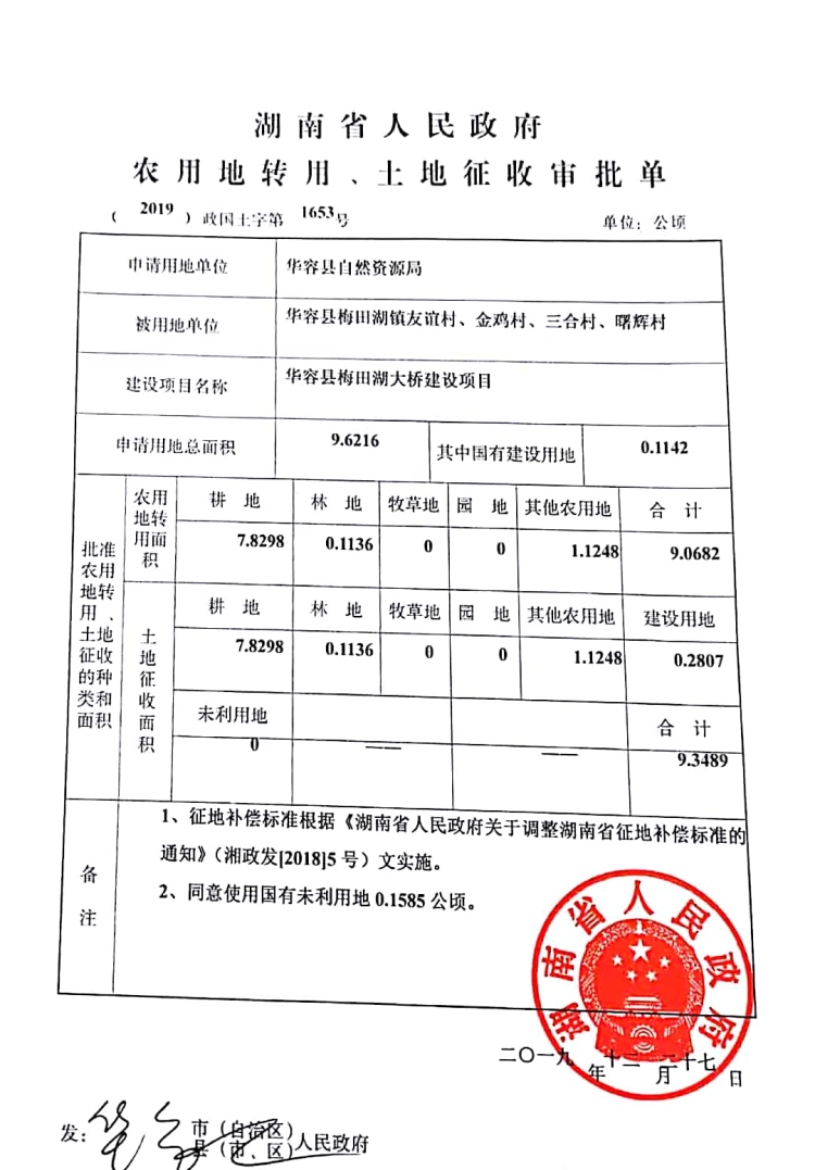 湖南省人民政府关于华容县梅田湖大桥农用地转用、土地征收审批单