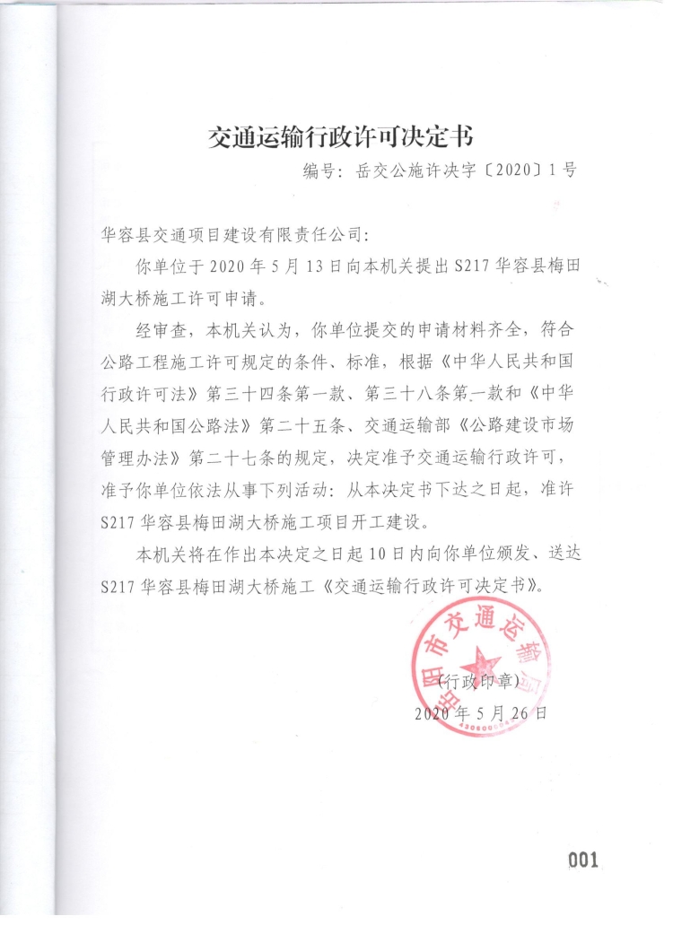 梅田湖大桥施工《交通运输行政许可决定书》