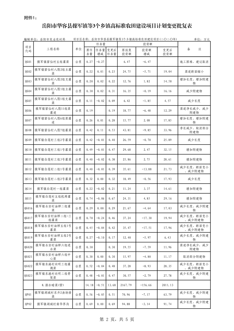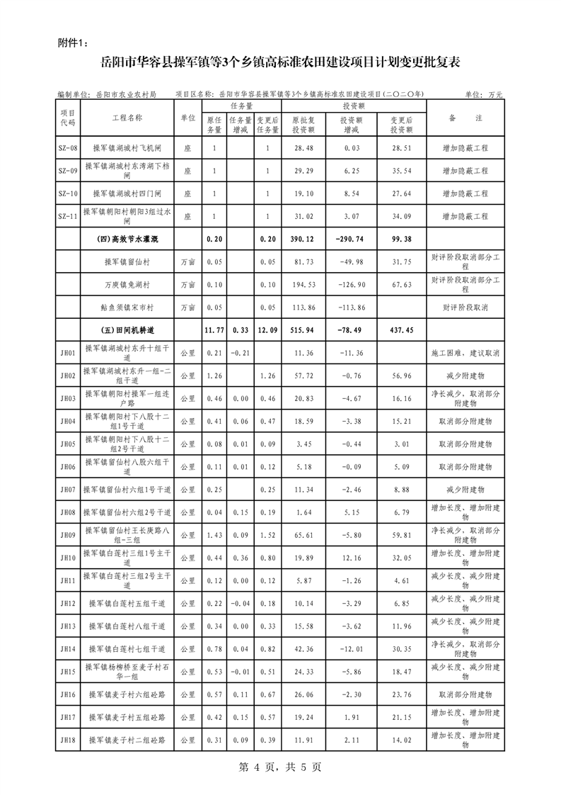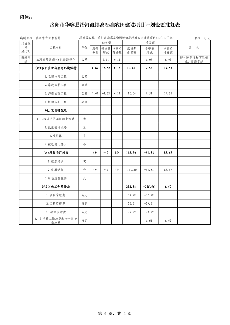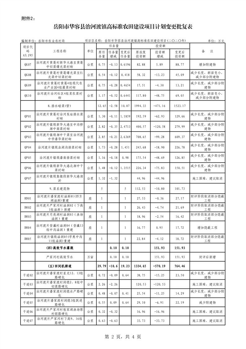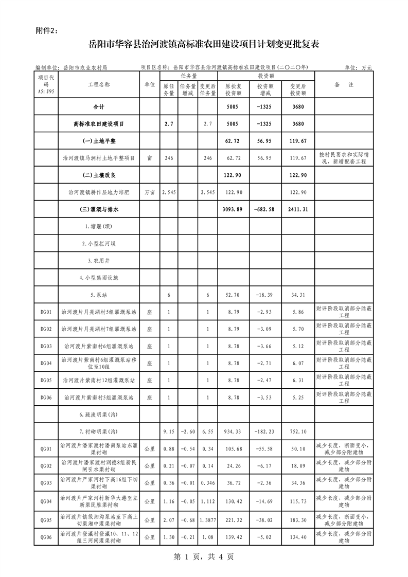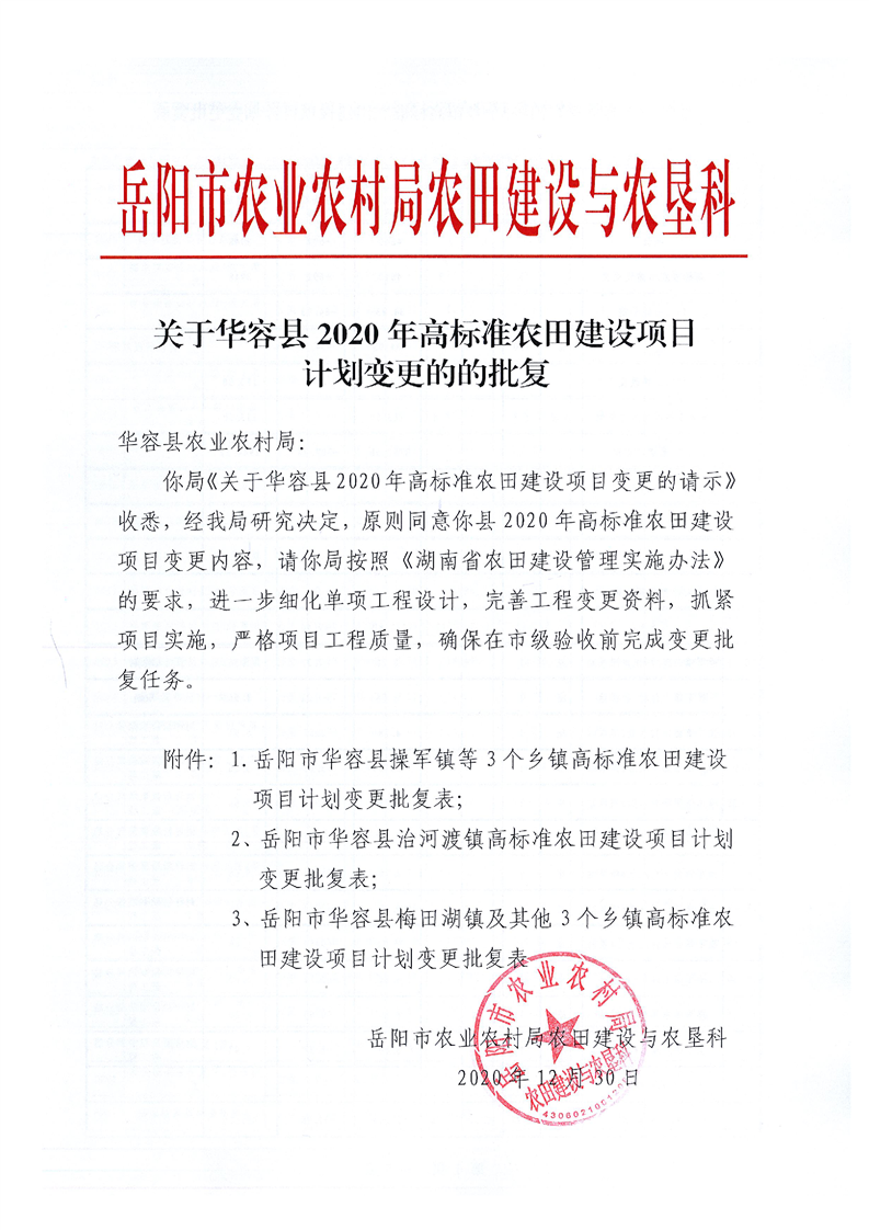 关于华容县2020年度高标准农田建设项目变更的批复