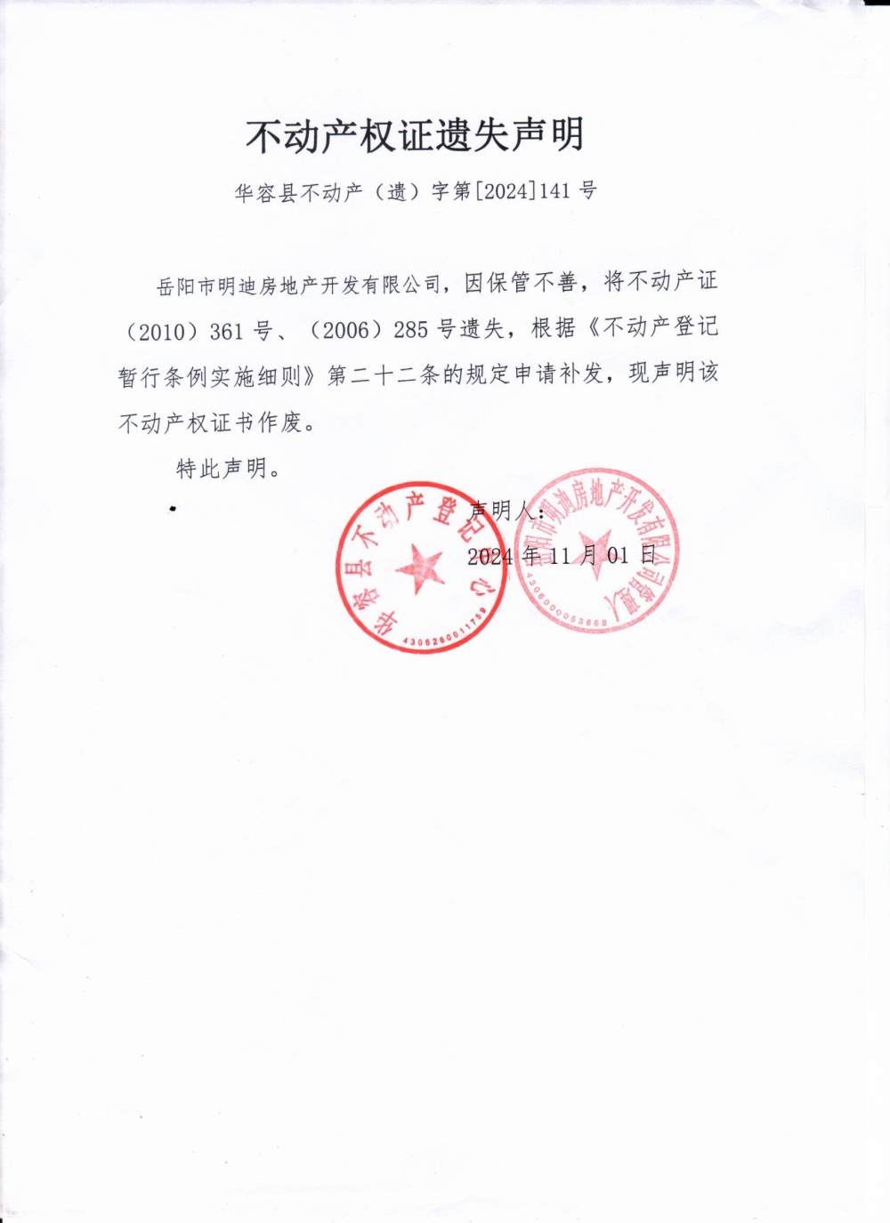 不动产权证遗失声明(岳阳市明迪房地产开发有限公司)