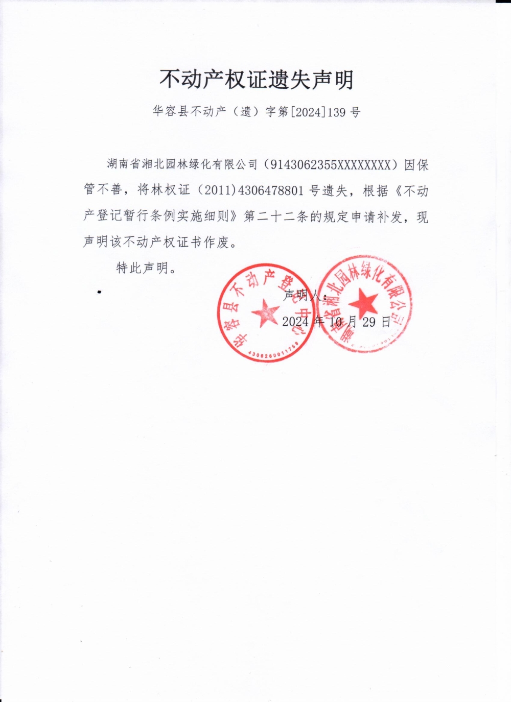 不动产权证遗失声明(湖南省湘北园林绿化有限公司)