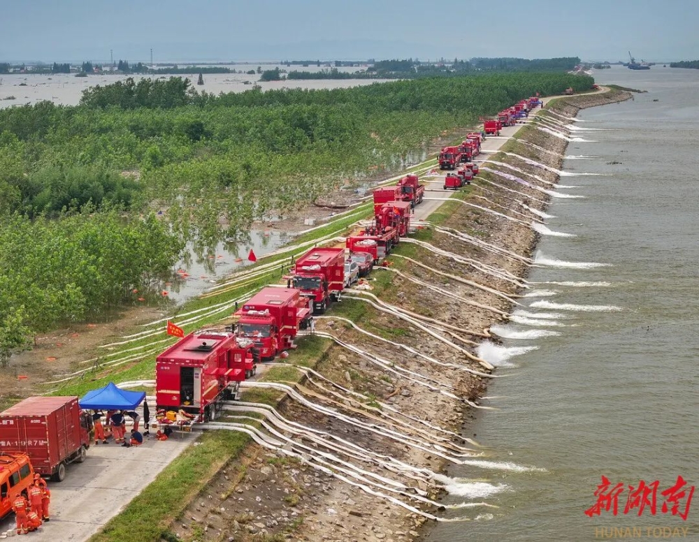 抽水排涝,作业队伍形成“长龙”7月9日7时许,团洲垸启动垸内积水排涝作业。7时55分,岳阳消防支队排涝分队33人带着两台排涝车、六台排涝拖车,赶到团洲垸排涝地点,开始第一批抽排积水。9时左右,国家矿山应急救援队华锡大队华锡中队27名队员驾驶两台排涝车,从广西风尘仆仆赶来。一下车,队员们来不及休息,马上分工,紧急安装排涝设备。4根进水管,6根出水管,一台小型水泵车接上两种不同的水管后,水管铺设开来,跨越堤坝。堤的一边,进水管不时“冒泡”;堤的另一边,水从出水管源源不断涌出,流入洞庭湖。“6根水管同时抽,每小时可抽排2000立方米,一天下来,预计抽排4.8万立方米。”华锡中队副中队长梁奋说,尽管24小时作业不停,但团洲垸的积水严重,因此工程量也会很大。团洲垸地形呈两边高、中间低的特点,排水初期17.2千米堤防都可以同时向外排水。中午时分,记者沿团洲垸一线大堤一路步行,看见各种不同的排涝队伍,已排起“长龙”。一排排抽水泵开始抽排积水,团洲垸的“修复”加快。多方支援,让群众尽快重返家园团洲垸积水量之大,排水需要较长时间。从9日起,各方力量全面进抵一线,全力支持团洲垸排涝。国家防总办公室、应急管理部从湖北、福建、四川、广东、广西、安徽等地调派排涝力量实施跨省区增援,执行积水排涝任务。国家矿山救援华锡队、四川排水队,危化救援武汉石化队、茂名石化队、湖南队,隧道救援太原队,国家安全生产应急救援新兴际华队等7支国家级专业队伍连夜赶赴,39车217名救援人员展开作业。按照应急管理部统一部署,国家消防救援局调派湖北、重庆、贵州三地消防救援力量,219名消防救援人员、72辆消防救援及排涝车辆9日上午全部抵达现场,会同湖南消防救援队伍开展排涝除险作业。既有“国家队”,也有民间队伍。7月9日,省防办、省应急厅紧急调度,盈峰环境组织50人应急救援精干力量,携13台大流量排涝车,火速赶到团洲垸应急排涝。一天之内,省防办、省应急厅紧急调度三一重工、中联重科、中国铁建、湖南建设投资集团、湖南百舸水利建设股份有限公司等多家单位,携41台排涝设备增援团洲垸。“预计10日8时前,还有第三批45台排涝车将抵达。”省应急管理厅相关负责人表示,将尽全力调派排涝力量,抓紧时间抽排积水,让受灾百姓尽快重返家园。 |
