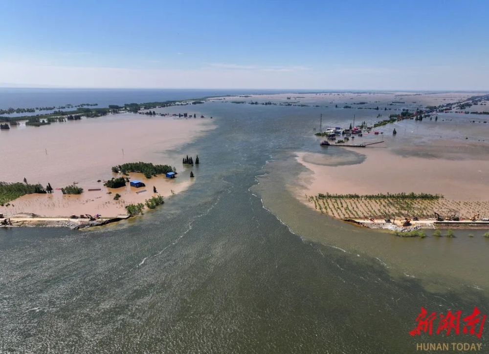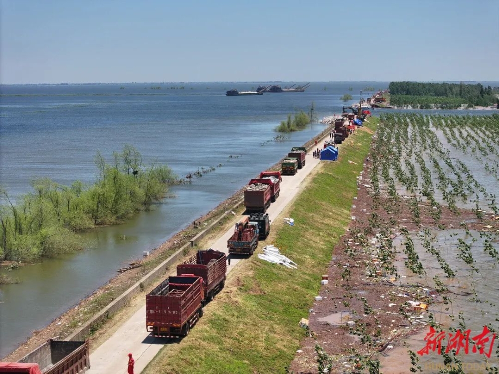 图为溃口处。 记者从现场看到,十几公里长的洞庭湖一线堤防被洪水拦腰冲断。在靠近君山钱南垸一侧大堤上,一辆辆装满砂石和块石的重型卡车排起了长龙,依次等待“卸货”,其中不少车上还挂着外地驰援华容的横幅。同时,各方救援力量不断集结,现场搜救工作仍在紧张进行中。