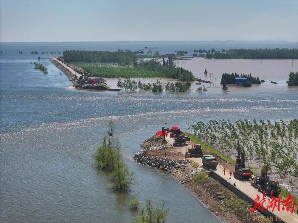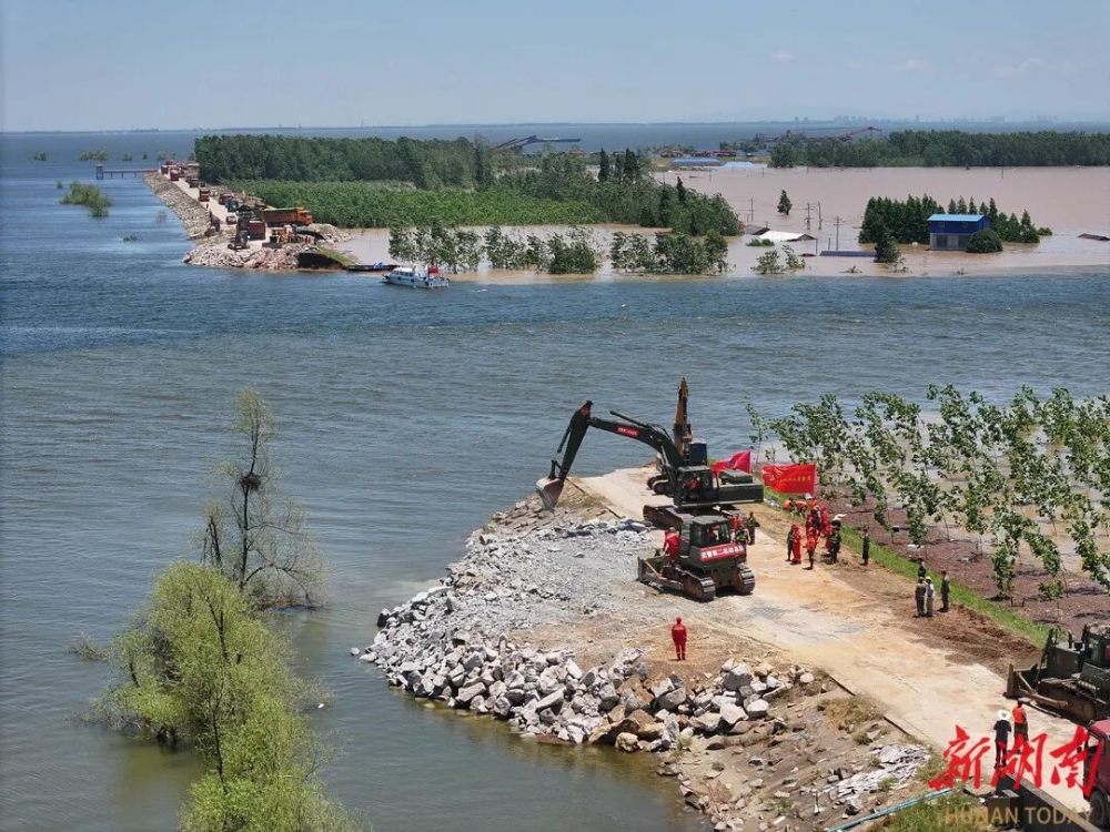 0.2米、0.15米、0.1米……7月6日中午12时,华容县团洲垸洞庭湖一线堤防(桩号19+800)处,随着溃口处内外水位落差进一步缩小,多台挖机和推土机正全力进行抛石固脚作业,团洲垸预计最快下午可开始合龙作业。