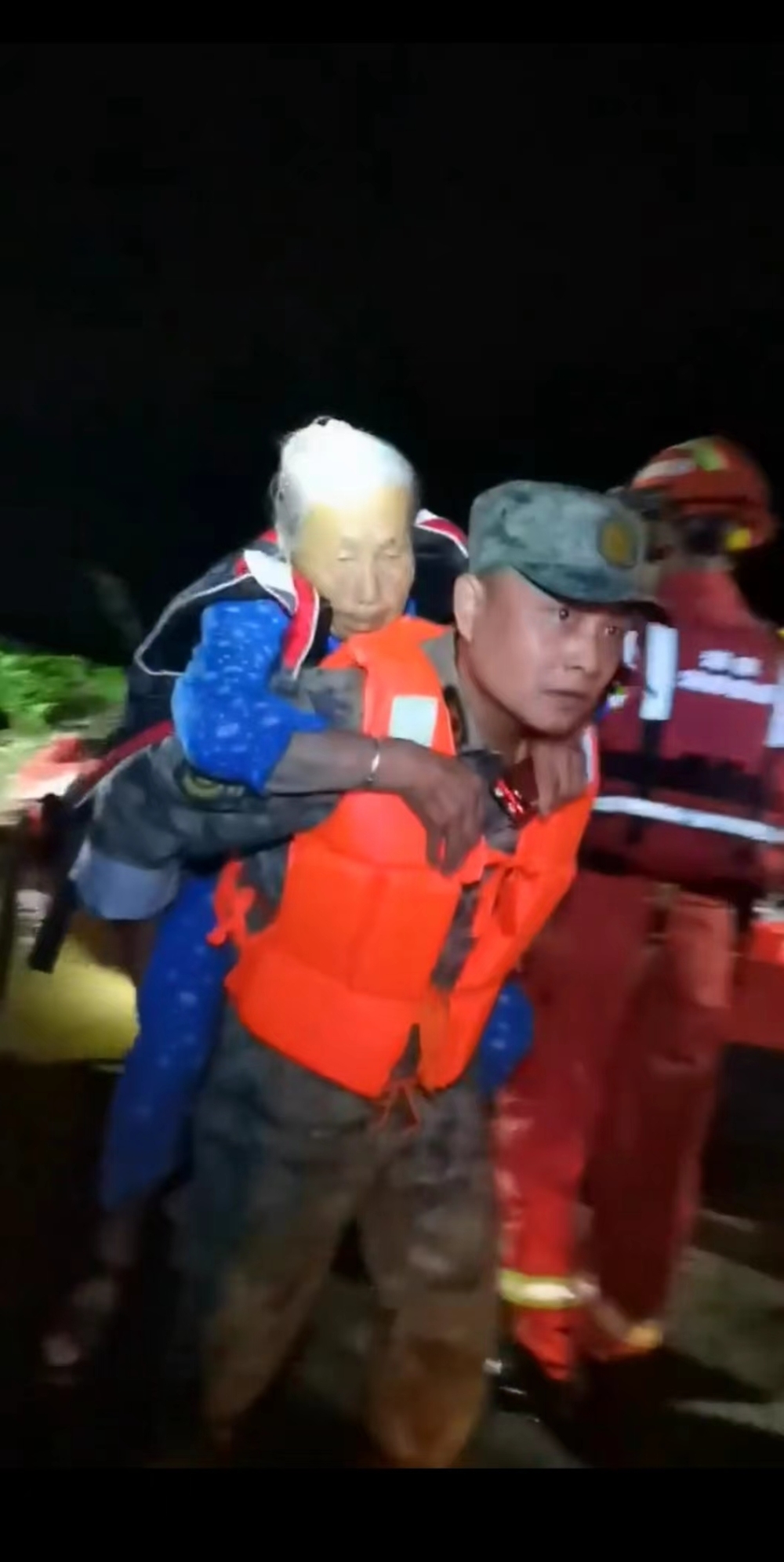 22时55分,溃决大堤撕开了更大的口子,水流速度加快,险情加剧,但军分区抢险官兵无一人后退。在团北村村口一处民房3名老人被困,其中1名90岁老人,一楼被淹、二楼被防护窗锁住,华容县人武部保障科长魏伟和2个民兵驾着冲锋舟赶到现场,爬上二楼窗户,拆开防护窗,因老人年事已高,救援官兵用事先携带的救援梯、安全绳等,多番努力,终于将老人救出。