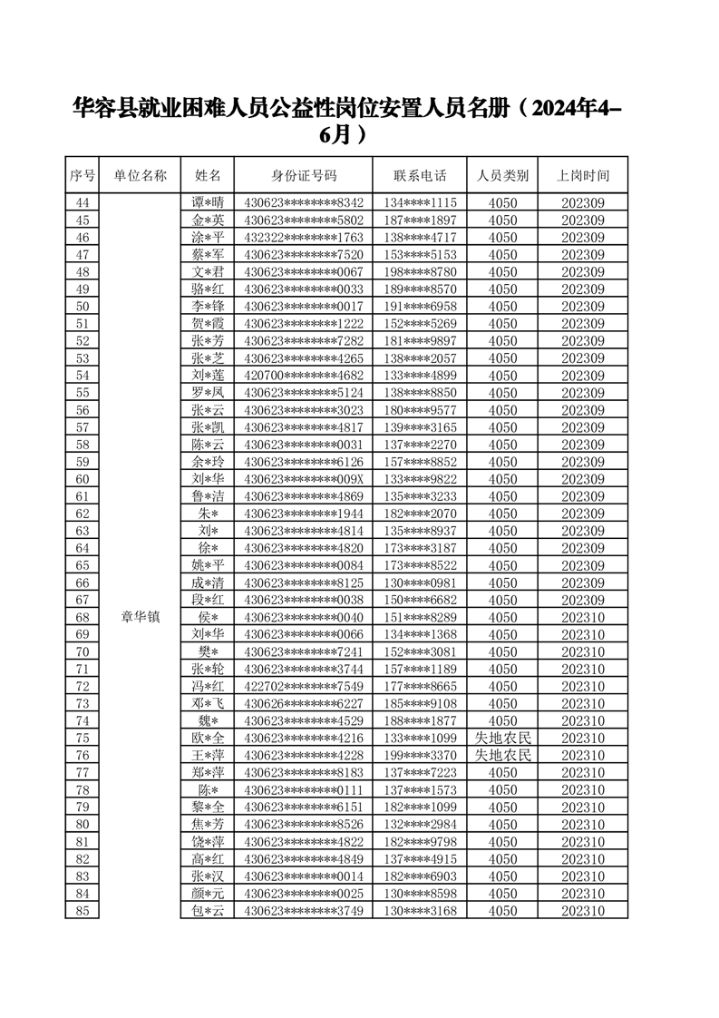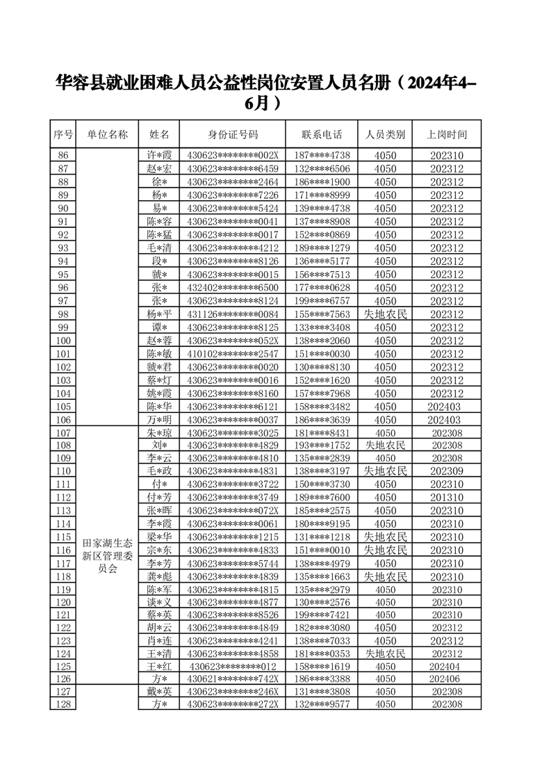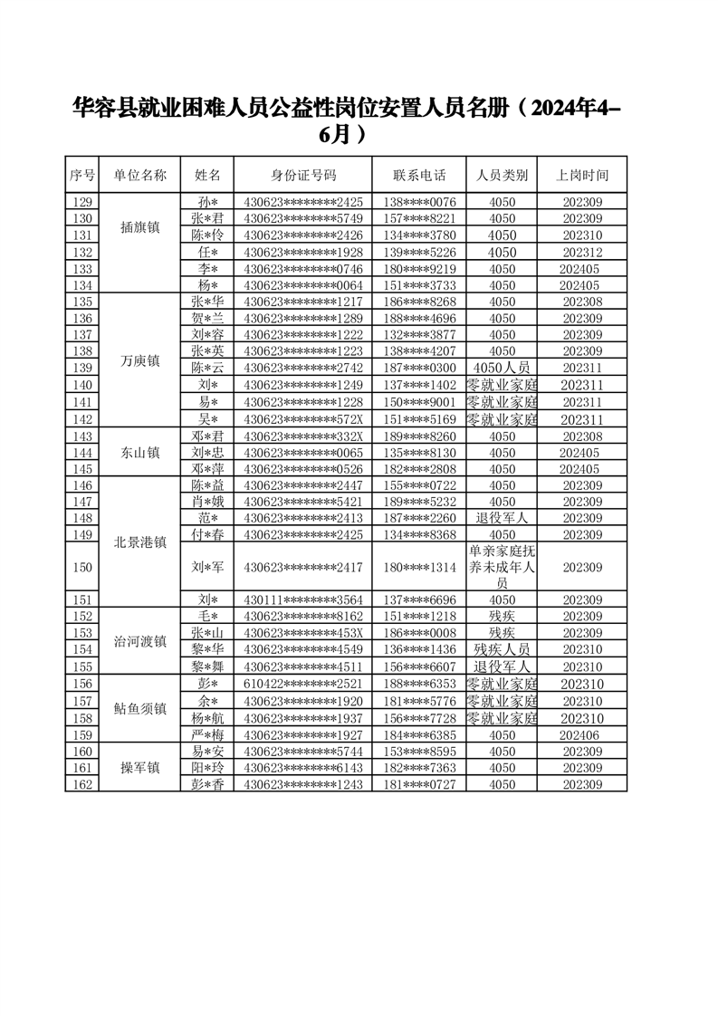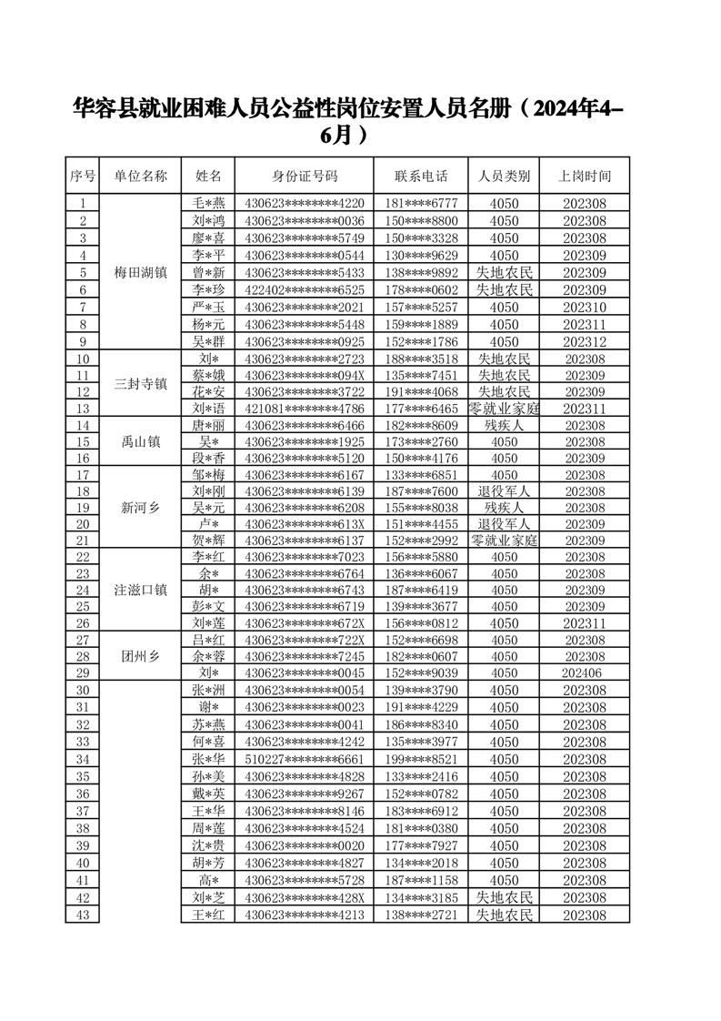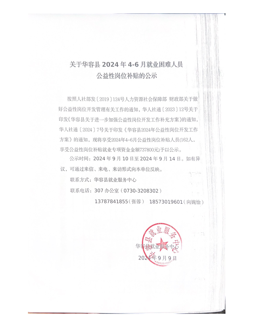 关于华容县2024年4-6月就业困难人员公益性岗位补贴的公示